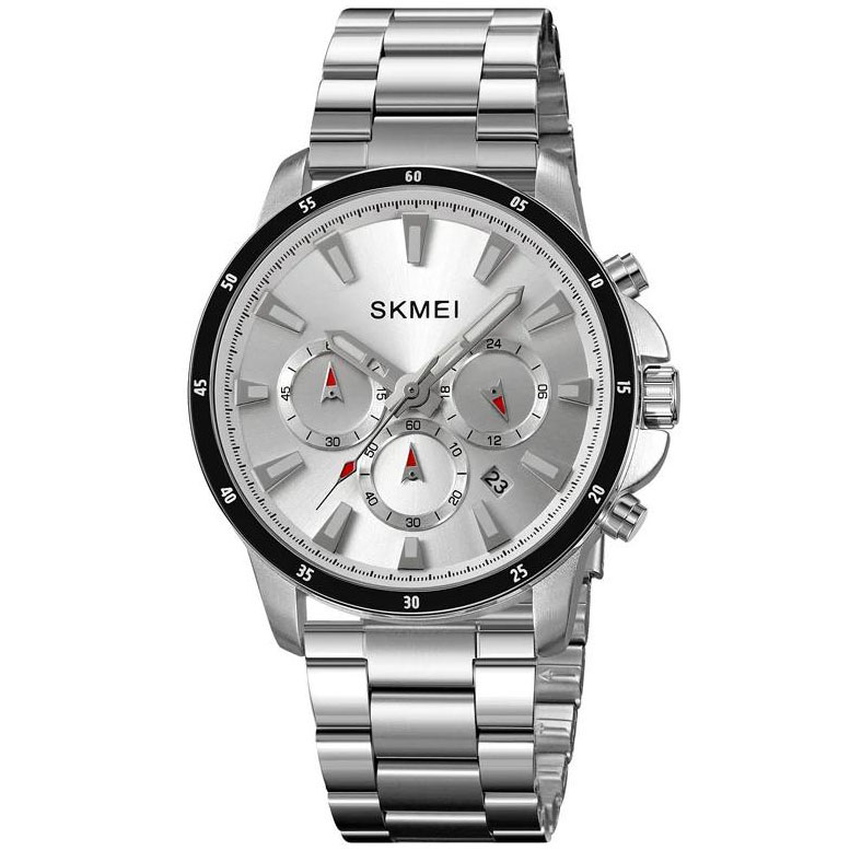 Годинник SKMEI 2295SI — це втілення сучасної елегантності з діловим характером. Сріблястий металевий корпус і браслет гармонійно поєднуються з циферблатом у тон, на якому розташовані три функціональні міні-циферблати та віконце дати. Чіткі стрілки та мітки забезпечують відмінну читабельність, а стриманий блиск металу додає годиннику статусного вигляду.
