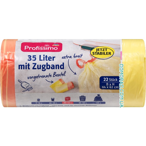 35-літрові сміттєві пакети Profissimo зі шнурком не тільки герметичні та стійкі до розривів, але й надзвичайно широкі. Шнурок дозволяє легко зав'язувати вузли та транспортувати. Нова відривна стрічка також полегшує відкривання.