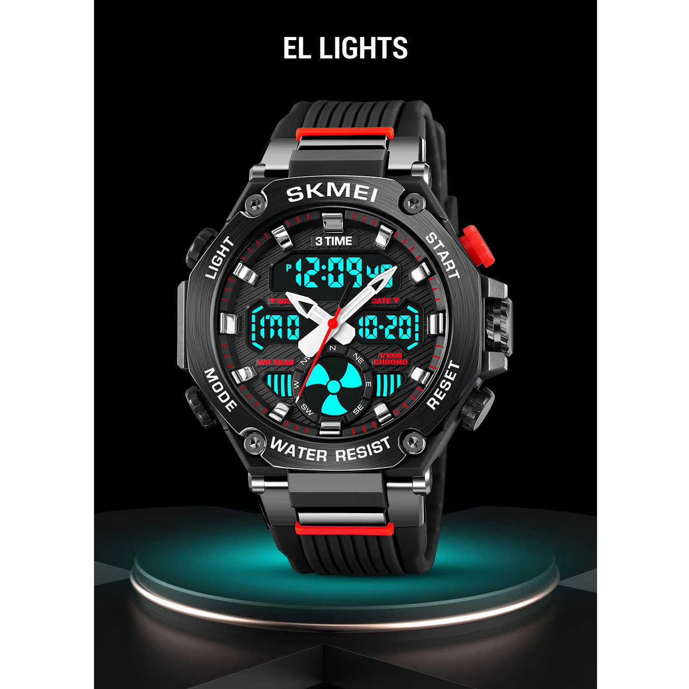 SKMEI 2223BK — це яскравий спортивний годинник із характером, який точно не залишиться непоміченим. Завдяки виразному дизайну з червоними елементами, металевими деталями корпусу та поєднанню аналогового і цифрового дисплея, ця модель виглядає потужно та технологічно. Масивний корпус і брутальні кнопки підкреслюють його стиль, а зручне розташування екранів забезпечує швидкий доступ до всіх функцій.