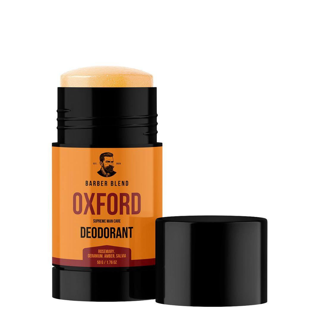 Парфумований чоловічий дезодорант Barber Blend OxfordЧоловічий твердий дезодорант-стік Oxford — твій надійний захист у ритмі активного життя. Амбра та розмарин створюють м'який аромат морського бризу. Шавлія розкривається нотами зеленого чаю та трави. Герань надає солодкувато-пряний акцент.Цей чоловічий дезодорант для пахв — для тих, хто цінує комфорт, впевненість і бездоганний догляд за собою. Формат твердого дезодоранта-стіка забезпечує зручне нанесення й надійний захист без слідів на одязі.Переваги чоловічого парфумованого дезодоранту Oxford:надійно захищає від неприємного запаху на весь день; не подразнює шкіру, зберігає її м'якою та доглянутою; містить натуральні олії та екстракти.Цей сухий дезодорант для чоловіків ідеально підходить для повсякденного застосування, тренувань, подорожей та інтенсивного ритму життя. Дезодорант стік для чоловіків Oxford подарує вам свіжість, турботу та стильний аромат.Як використовувати:Прийміть душ. Нанесіть дезодорант тонким шаром на суху шкіру пахв. Дайте підсохнути.Вага: 50 г