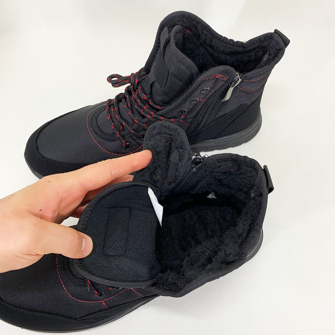 Стильні чоловічі черевики на осінь і зиму — це практичне взуття з утепленням, яке ідеально підходить для щоденного використання у холодну пору року. Вони виготовлені з міцного текстилю з вставками зі штучної замші, мають високий верх і шнурівку для щільної посадки на нозі. Червона контрастна строчка додає моделі виразності та сучасного вигляду.