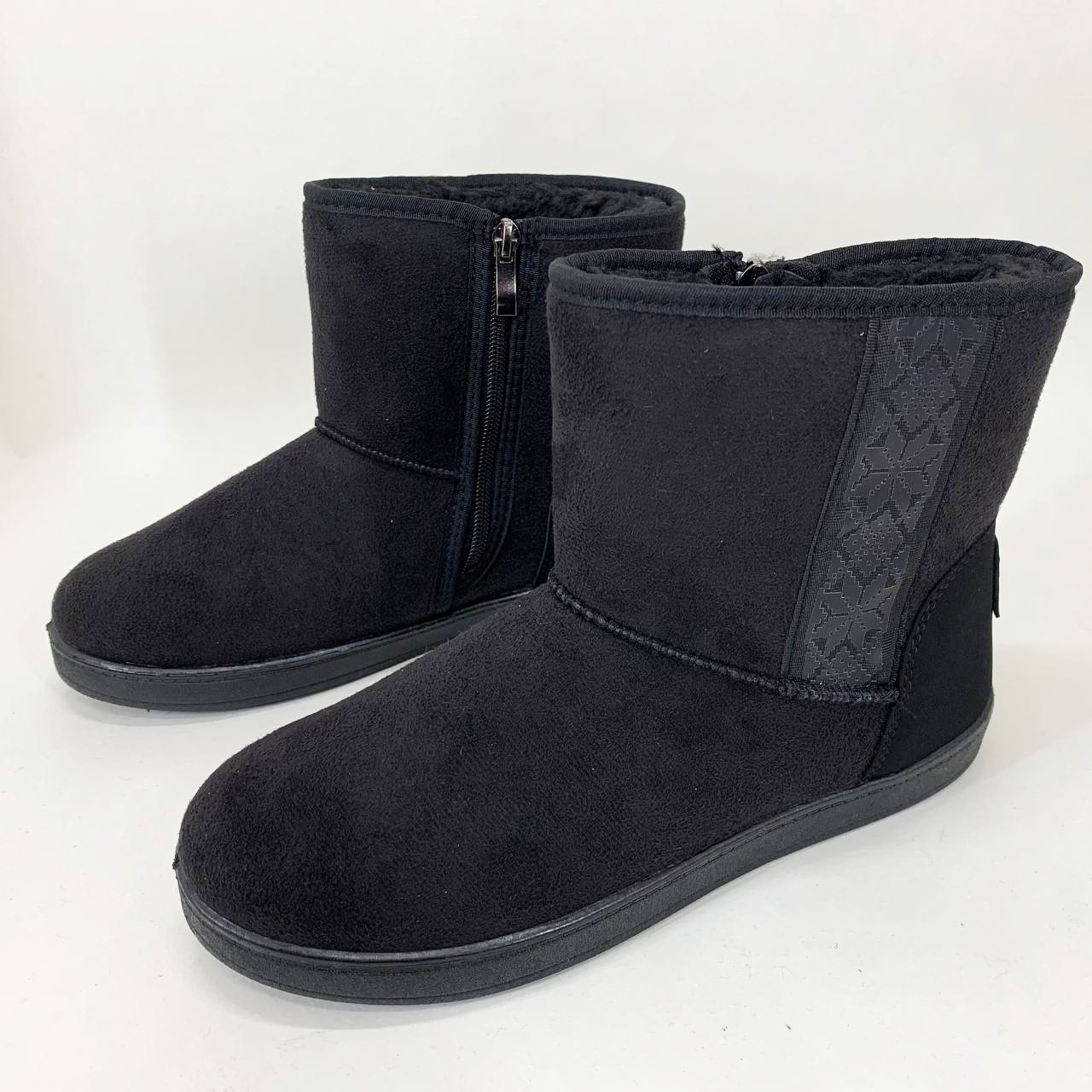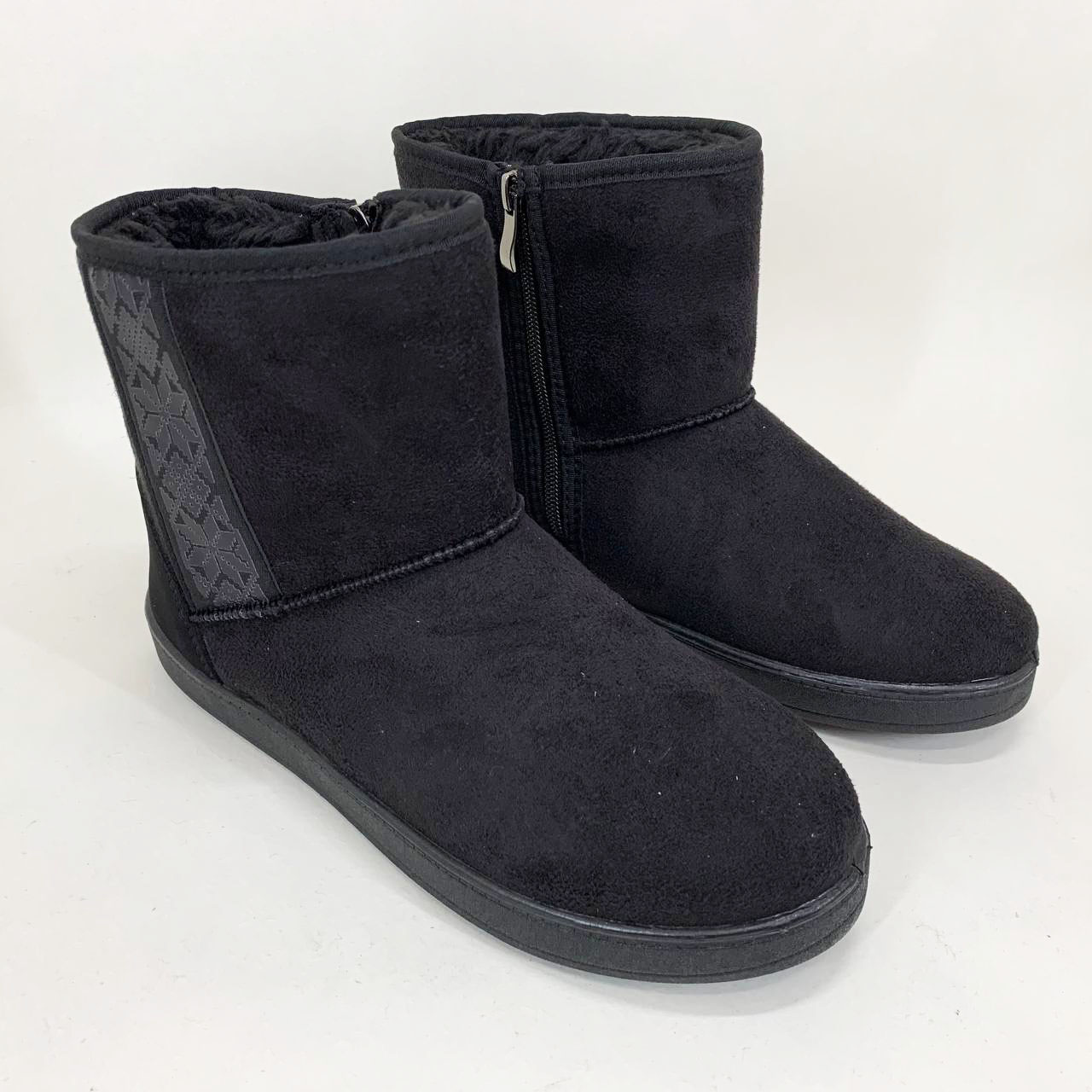 Утеплені жіночі уггі — це взуття, яке поєднує затишок, тепло і лаконічний стиль. Модель виконана у глибокому чорному кольорі з м’якого текстилю під замшу, що додає образу елегантності. Декоративна вставка з візерунком на халяві створює акуратний акцент і надає взуттю індивідуальності. Ідеально підходить для щоденного носіння у холодну пору року.