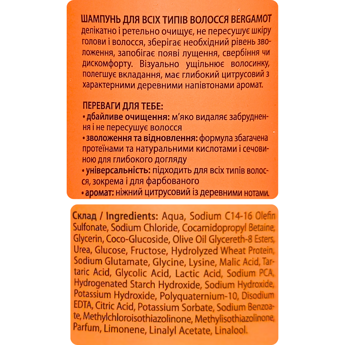 Парфумований шампунь для волосся для чоловіків Barber Blend Bergamot — протеїни, натуральні кислоти, сечовинаЧоловічий шампунь Barber Blend Bergamot забезпечує делікатне, але глибоке очищення волосся та шкіри голови без пересушування. Формула з протеїнами, натуральними кислотами та сечовиною відновлює баланс вологи, зменшує лущення та свербіння, а також зміцнює структуру волосся.Аромат бергамоту з деревними напівтонами створює відчуття свіжості й доглянутості протягом дня, а текстура шампуню полегшує укладання та підтримує охайний вигляд зачіски.Основні властивостіЯк працює:делікатно очищує волосся та шкіру голови від забруднень;