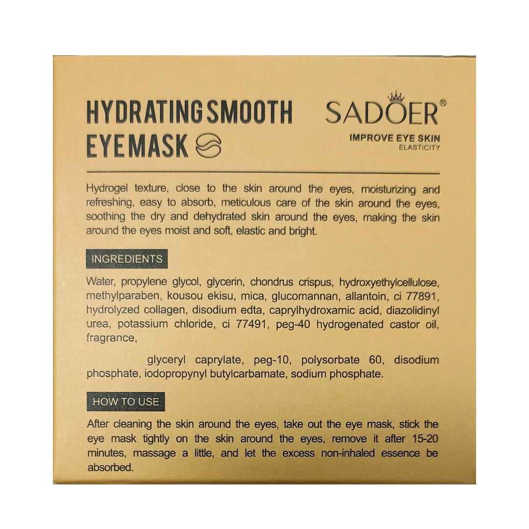 Патчі під очі зі зволожувальним і ліфтинг-ефектом Sadoer Hydrating Smooth Eye MaskМаска для очей у форматі гідрогелевих патчів створена для інтенсивного догляду за ніжною делікатною шкірою. Засіб глибоко зволожує, допомагає розгладити набряки, освітлює темні круги під очима та підвищує еластичність шкіри повік. Завдяки м'якій гідрогелевій текстурі патчі щільно прилягають до шкіри, забезпечуючи швидку та дбайливу дію.Ефект застосування:інтенсивне зволоження та живлення тонкої шкіри повік; згладження набряків і дрібних зморщок; освітлення шкіри навколо очей і зменшення темних кіл; підвищення пружності та еластичності; ідеальний догляд для сухої та зневодненої шкіри повік.Активні компоненти:гліцерин — зволожує й утримує вологу, пом'якшує шкіру; екстракт хондрусу кучерявого(Chondrus crispus) — джерело мінералів, зміцнює і відновлює шкіру; алантоїн — заспокоює, знімає подразнення, робить шкіру гладкішою; гідролізований колаген — підвищує пружність і згладжує зморшки; рицинова олія — живить і пом'якшує шкіру, захищає від сухості.Бюджетні гідрогелеві патчі для шкіри навколо очей — це ефективний засіб проти зморщок, темних кругів і набряків, який поверне шкірі свіжий і сяйний вигляд.Спосіб застосування:Після очищення шкіри навколо очей дістаньте патчі, щільно прикладіть до шкіри та залиште на 15-20 хвилин. Акуратно зніміть і злегка помасажуйте зону очей, щоб есенція повністю вбереться.Кількість у пакунку: 60 штук або 30 пар