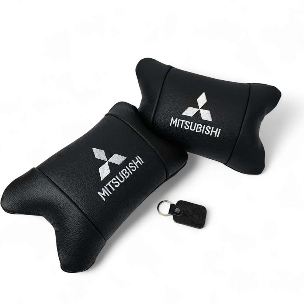 Подушки Mitsubishi з натуральної шкіри, Автоподушки на підголовник + шкіряний брелок з логотипом