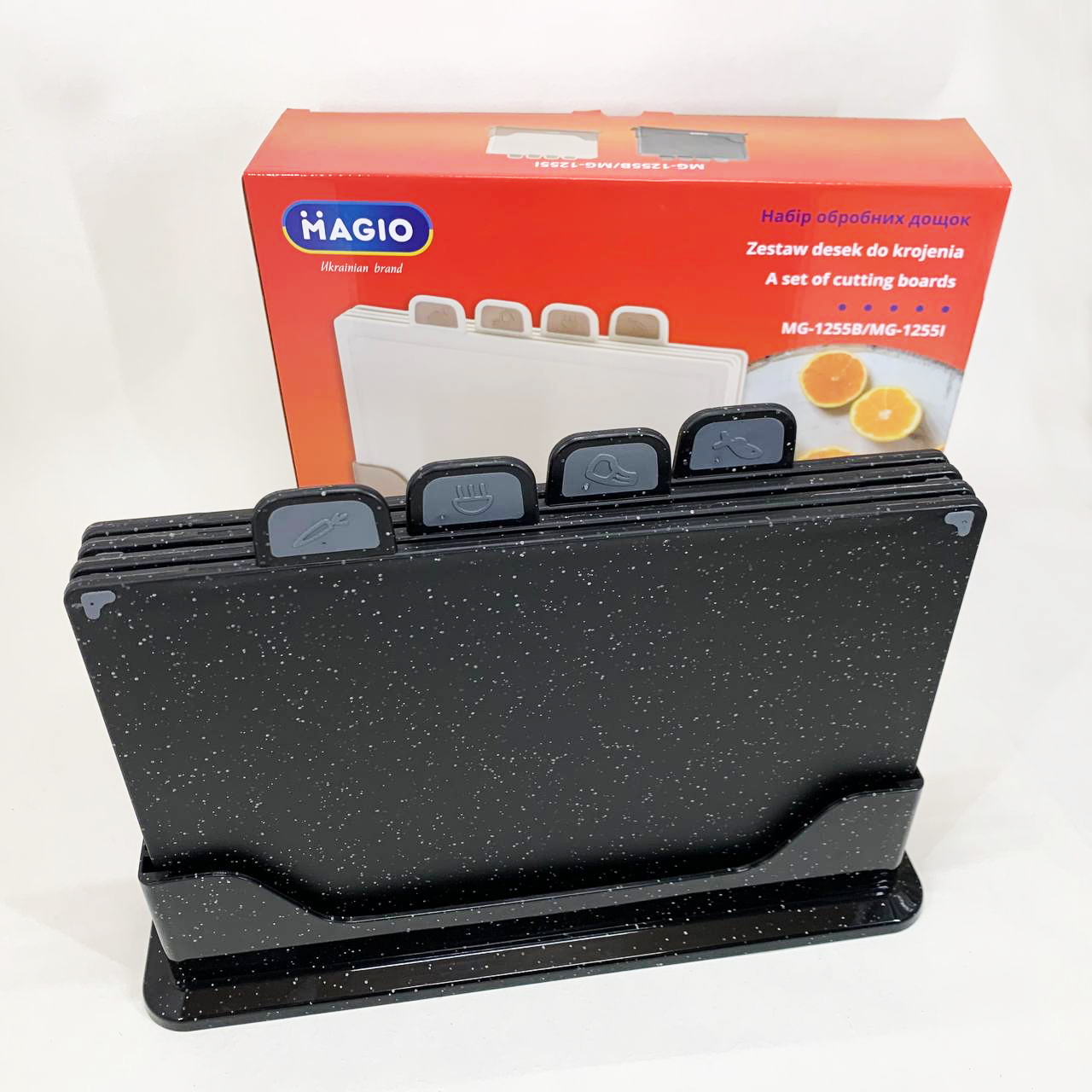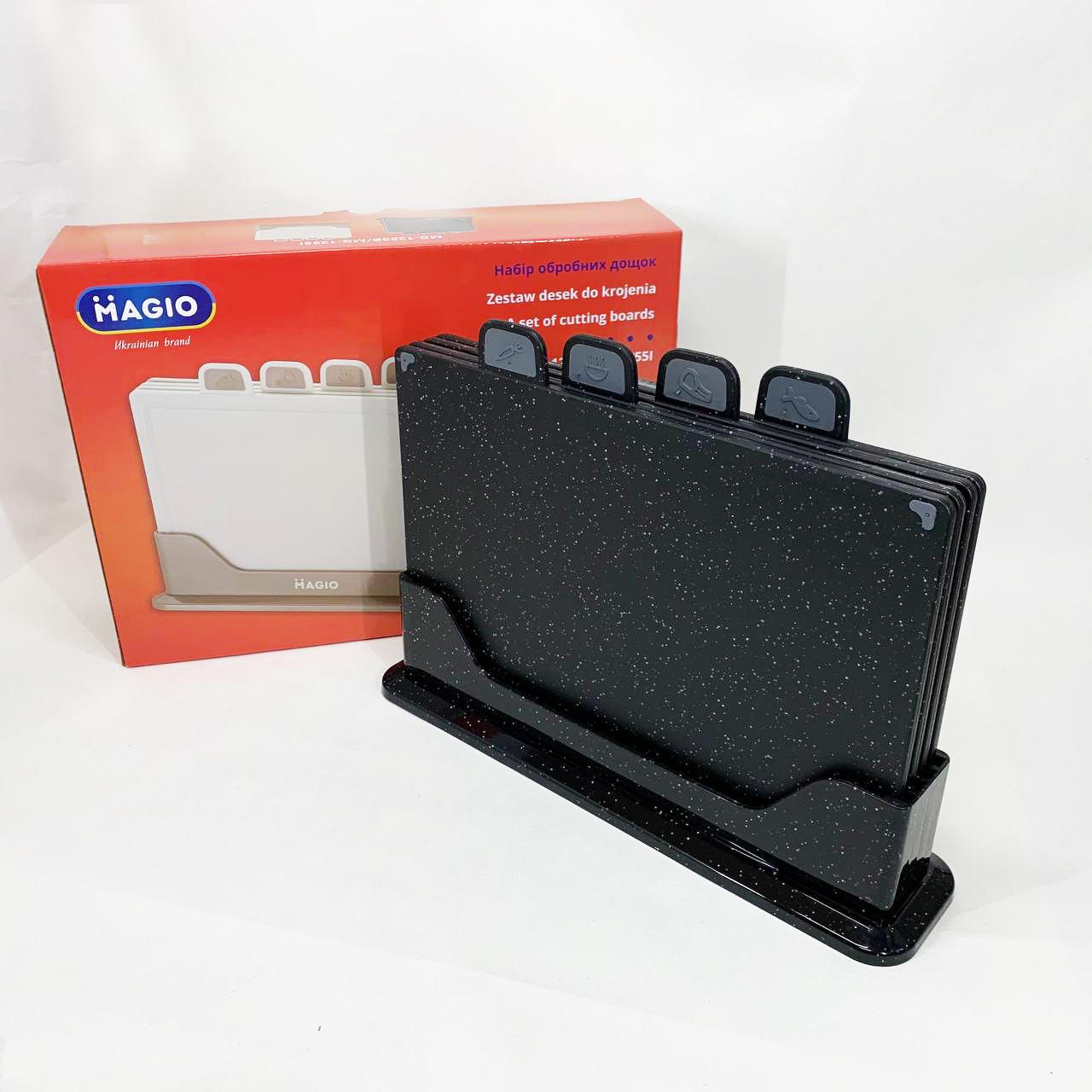 Набір Magio MG-1255B призначений для нарізання різного виду продуктів: овочів, фруктів, м’яса, риби та хліба. Чотири окремі дошки дозволяють уникнути перехресного забруднення, що особливо важливо при підготовці їжі з різними вимогами гігієни. Компактна підставка забезпечить зручне зберігання, підтримуючи порядок на робочому столі.
