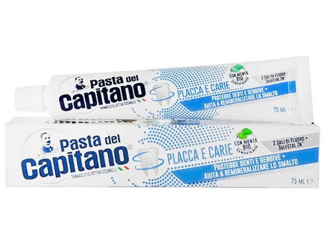 Зубна паста Pasta del Capitano Проти карієсу та зубного нальоту забезпечує ретельне чищення порожнини рота й дієвий захист від зубного нальоту та каменю, а вміст двох фторсолей забезпечує ремінералізацію зубної емалі.