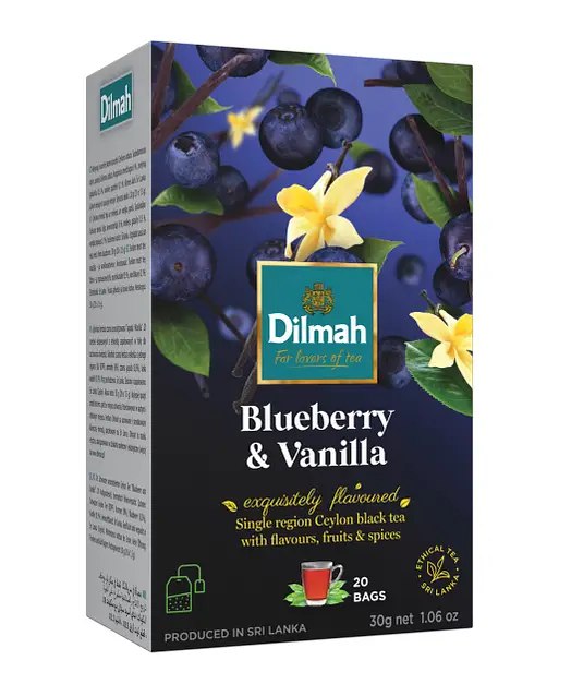 Черный чай Dilmah Blueberry & Vanilla в пакетиках 20 шт – это ваше удовольствие в каждом глотке. Дилма предлагает вам новый чай, в каждом пакетике которого черный листовой чай с плантаций Шри-Ланки с добавками голубики и ванили. Такое сочетание компонентов подарит вам незабываемый вкус напитка, в котором терпкость черного чая сочетается со сладостью спелых ягод и пряностью ванили. Заварите себе один пакетик и погрузитесь в мир приятных воспоминаний о теплых летних вечерах! В упаковке – 20 пакетиков, а это значит, что вы сможете приготовить 20 чашек вкусного чая для себя и близких вам людей.