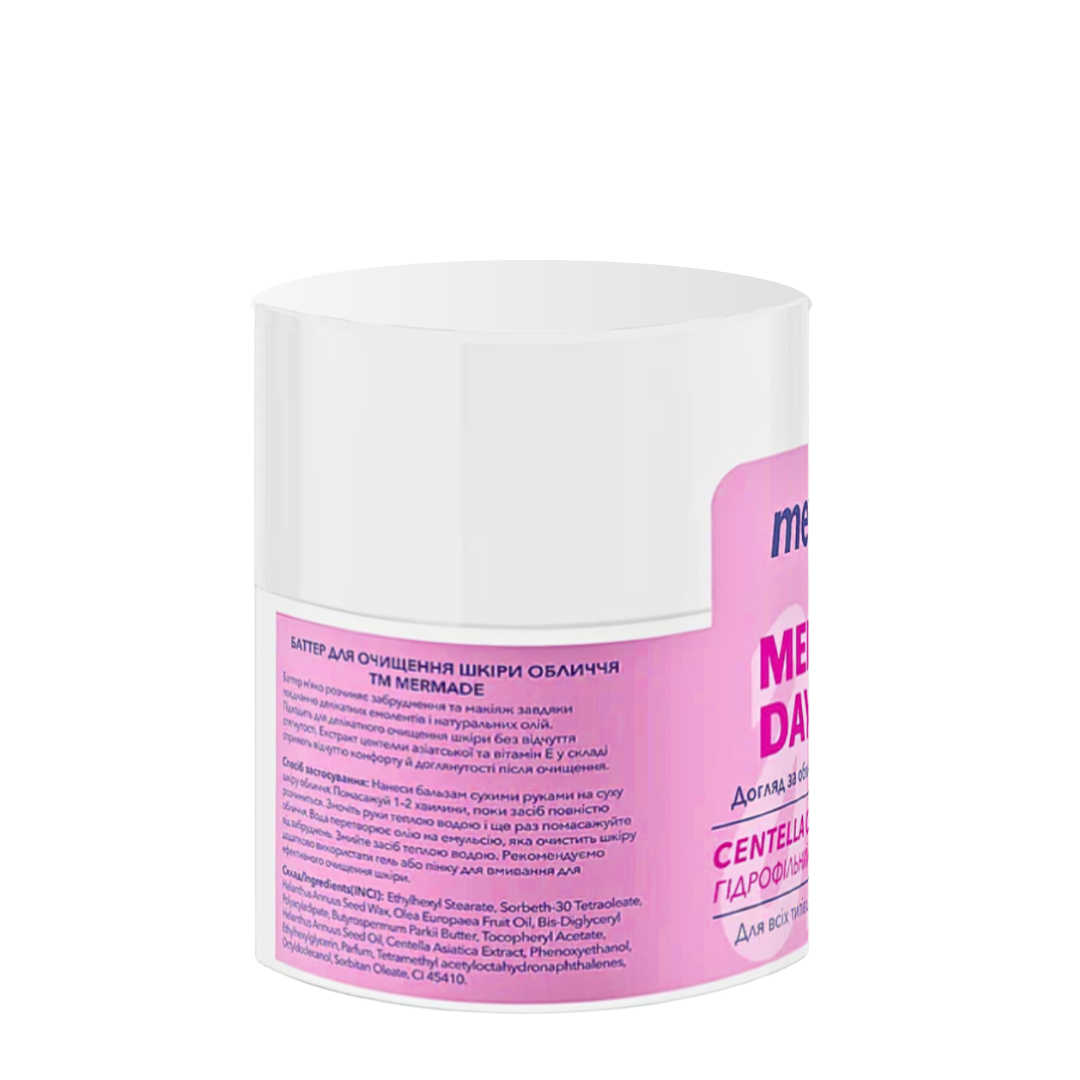 Гідрофільний батер для демакіяжу та очищення шкіри обличчя Mermade Melt The Day Off з центелою 45 гГідрофільний батер для очищення шкіри обличчя створений для того, щоб ніжно «розтоплювати» забруднення, що накопичуються впродовж дня — від стійкого макіяжу до пилу та себуму.Легка олійна текстура під час контакту з водою перетворюється на шовковисте молочко, що залишає шкіру чистою, м'якою й без відчуття стягнення. Це демакіяж підходить для всіх типів шкіри: сухої, жирної, комбінованої та чутливої.Переваги:зручна й економічна тара; не розтікається; легко дозується; використовується до останньої краплі.Активні компоненти:олія ши — відновлює, пом'якшує, запобігає сухості; олія оливи — живить, підтримує природний гідробаланс шкіри; екстракт центели азійської — знімає подразнення, сприяє рівному здоровому тону обличчя.Як користуватися:Трохи батера нанесіть сухими руками на суху шкіру обличчя. Масажуйте 1-2 хвилини. Змочіть долоні теплою водою і знову промасуйте, поки батер не перетвориться на емульсію. Змийте чистою водою. Завершіть очищення пінкою або гелем.Вага: 45 г