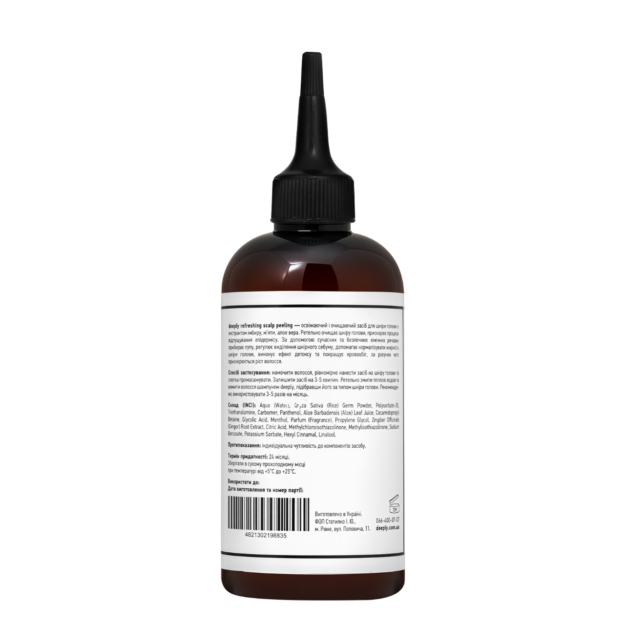 Deeply Refreshing Scalp Peeling — освіжний пілінг для шкіри голови з м'ятою, імбиром та алое вераВтомилися від жирності, лупи або неприємного відчуття забрудненої шкіри голови? Спробуйте Deeply Refreshing Scalp Peeling — освіжаючий пілінг для регулярного глибокого очищення та детоксикації скальпа.Формула з екстрактами імбиру, м'яти й алое вера м'яко видаляє ороговілі клітини, нормалізує виділення себуму, усуває лупу та стимулює кровообіг. Засіб забезпечує відчуття свіжості, легкості й ідеально готує шкіру голови до подальшого догляду.Deeply Refreshing Scalp Peeling — ідеальне рішення для тих, хто хоче зберегти шкіру голови чистою, здоровою та свіжою. Додайте цей етап до регулярного догляду за волоссям і відчуйте різницю вже після першого використання.Як працюють ключові компоненти пілінгу для волосся:імбир — покращує мікроциркуляцію, стимулює ріст волосся;