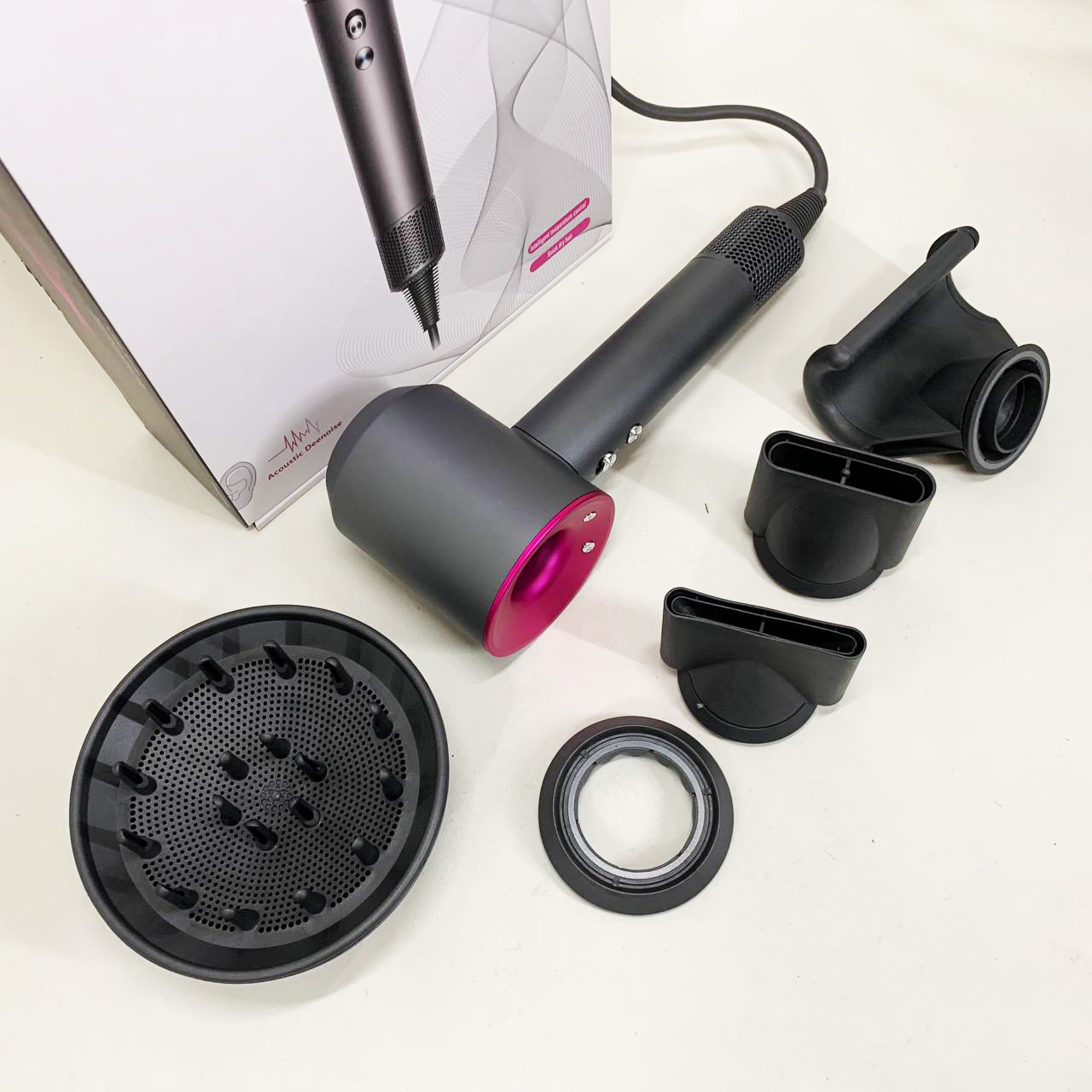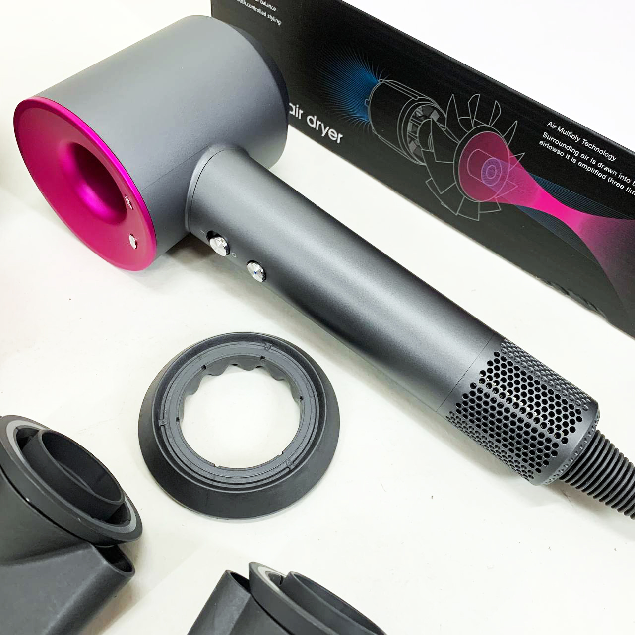 Завдяки магнітним основам змінювати насадки дуже просто, але при цьому вони зовсім не нагріваються під час роботи. Набір має також захист від перегріву, обдув холодним повітрям і має функцію іонізації.