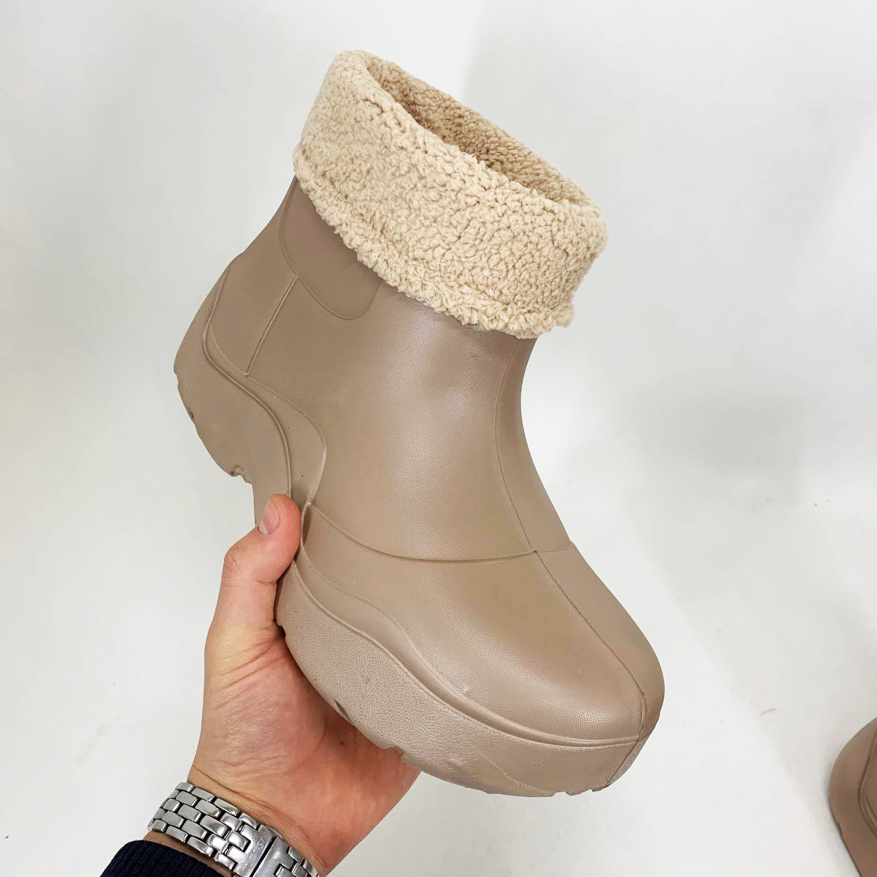 Жіночі гумові черевики — це практичне та зручне рішення для холодної і вологої пори року. Модель має стильний дизайн у світло-бежевому кольорі, що робить її універсальною для повсякденного носіння. Черевики виготовлені з литого водонепроникного матеріалу, доповнені утеплюючим внутрішнім оздобленням зі штучної вовни, що забезпечує тепло та комфорт навіть у морозні дні.