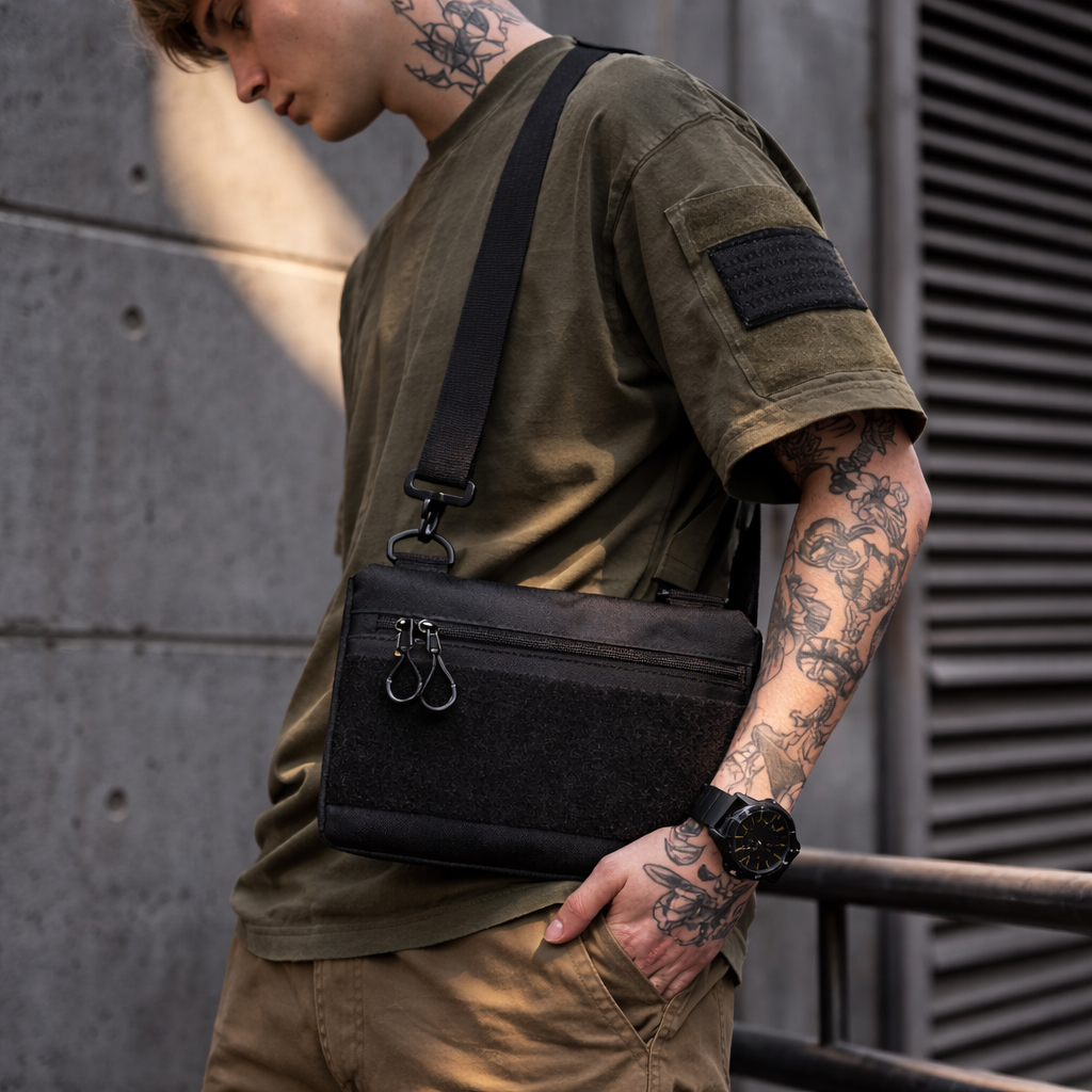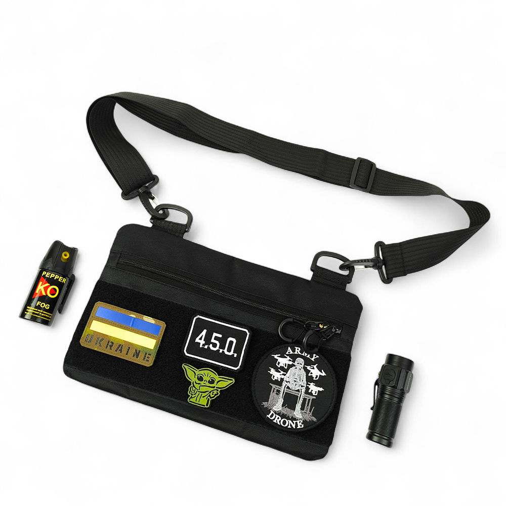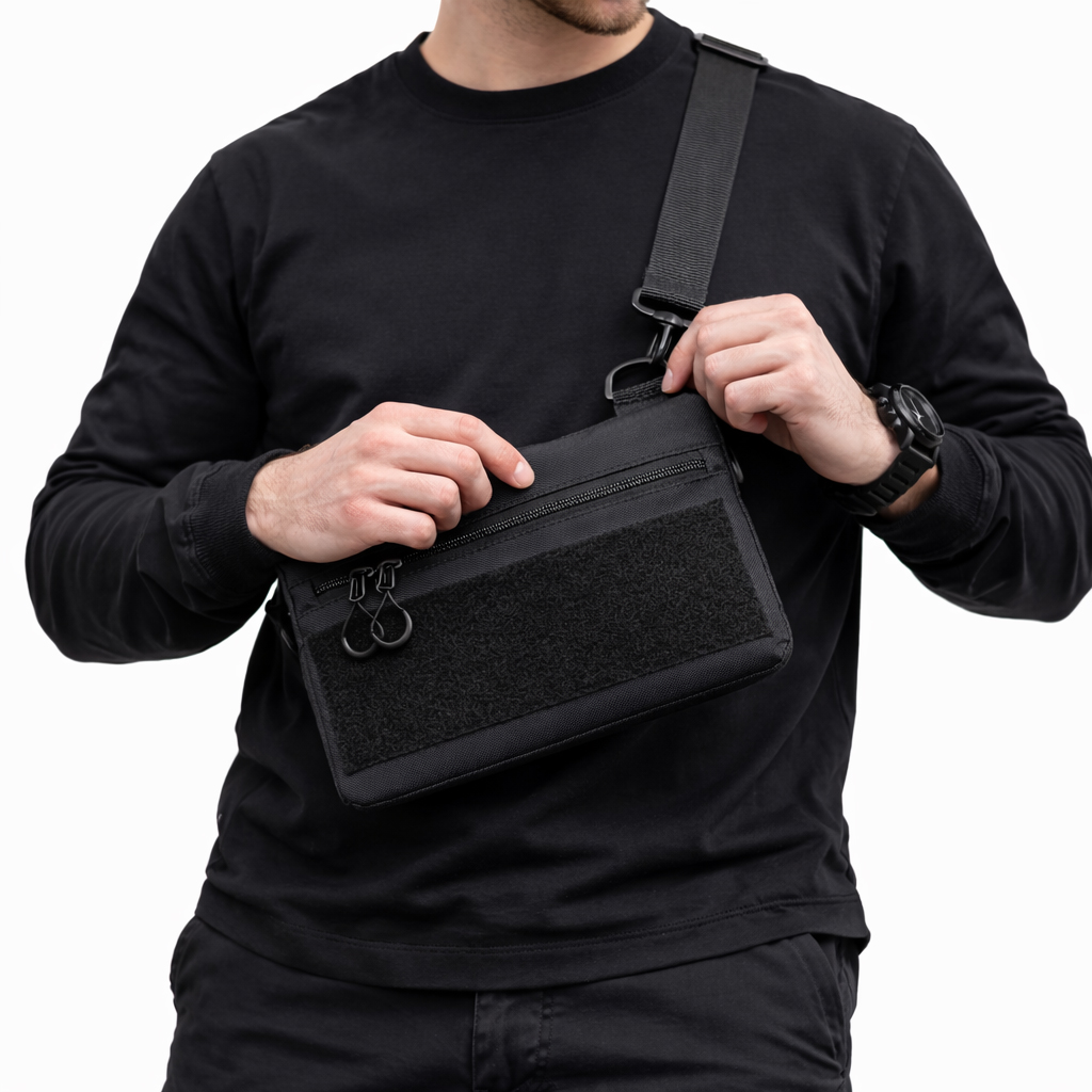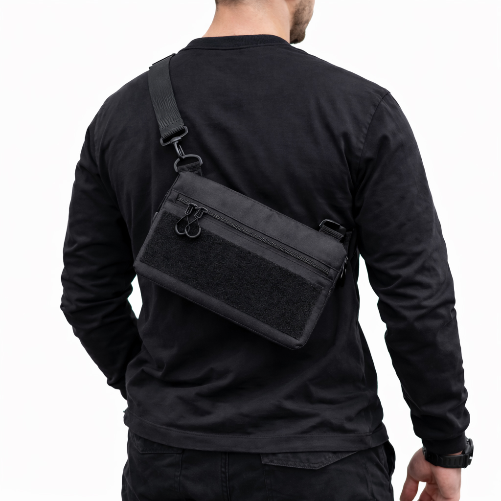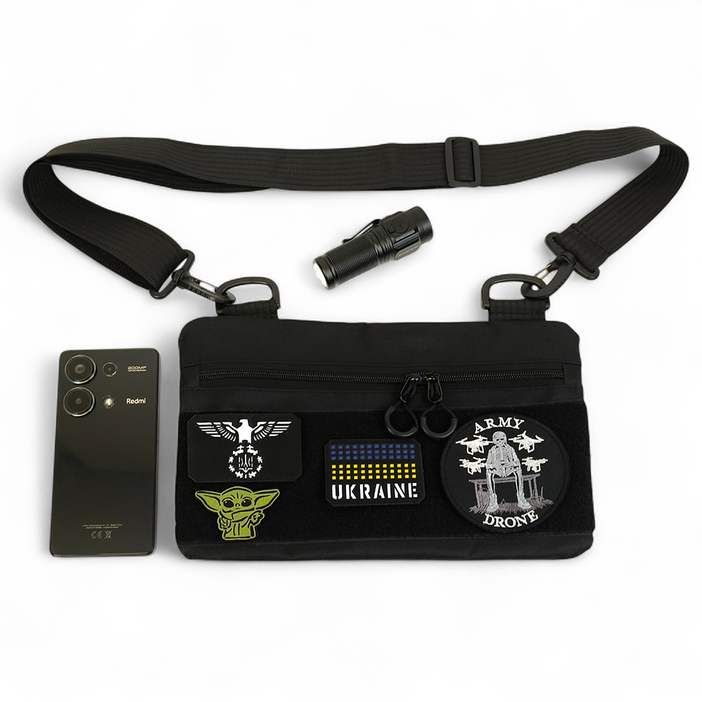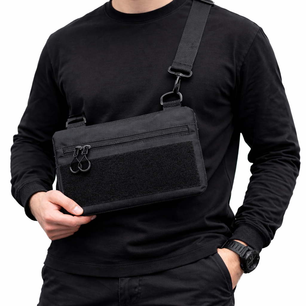 Чорний тактичний дизайн з пуллерами та регульованою міцною стропою робить сумку універсальною та стильною. Розмір 30 × 18 см — ідеальна компактність без втрати функціоналу.