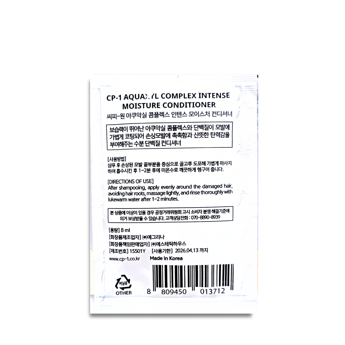 Професійний зволожувальний кондиціонер Esthetic House CP-1 Aquaxyl Complex Intense Moisture Conditioner для всіх типів волоссяКондиціонер від корейського виробника косметики для волосся Esthetic House усуває сухість і ламкість, надає пружність і живить, перешкоджає посіченості кінчиків. Засіб для догляду за волоссям повертає гладкість і блиск, полегшує розчісування й укладання, сприяє відновленню структури завдяки колагену, кератину, шовку, лецитину, протеїнам, амінокислотам та іншим корисним інгредієнтам у складі.Активні компоненти кондиціонера:запатентований комплекс рослинних цукрів Aquaxyl — забезпечує зволоження волосся, допомагає відновити ослаблені та ламкі пасма, робить волосся еластичнішим, перешкоджає появі сухості; комплекс натуральних олій баобаба, жожоба та аргани — відновлює структуру локонів, зміцнює їх, надає блиску, гладкості, еластичності та м'якості; вітамін Е — стимулює ріст волосся, зміцнює його та запобігає випаданню, надає локонам еластичність і м'якість, живить та оздоровлює шкіру голови; гідролізований колаген — відновлює волосся зсередини, збагачує колагеном і підвищує об'єм волосся, робить його гладким, усуває електризацію; гідролізований кератин і шовк — зміцнюють, відновлюють пошкоджені зони, сприяють їх живленню та зволоженню без обтяження, запобігають утворенню посічених кінчиків; гідролізований лецитин — підсилює регенерацію, ріст і живлення волосся і шкіри голови, регулює роботу сальних залоз, інтенсивно відновлює глибоко пошкоджене волосся; цераміди — відновлюють кутикулу волосини та повертають їм здоровий блиск і силу; протеїновий комплекс (пшениця, соя, кукурудза та рис) — утримує вологу та інтенсивно живить, надає гладкості та пружності.; амінокислотний комплекс — живить волосся, захищає, прискорює синтез власних кератину, колагену й еластину, стимулює ріст волосся; екстракт вівса — захищає від несприятливих чинників довкілля, регулює роботу сальних залоз, перешкоджає появі лупи, зміцнює волосся, надає блиску, пружності та об'єму.; екстракт бурих водоростей Фукоїдан — інтенсивно зволожує, надає силу та блиск на всій довжині, зміцнює корені та активізує ріст; шовкова пудра — поглинає надлишок шкірного сала та сприяє зменшенню жирності шкіри голови.Спосіб застосування:Потрібна кількість кондиціонера розподіліть на чистому вологому волоссі. За 2-5 хвилин ретельно змийте водою.Об'єм: 8 мл