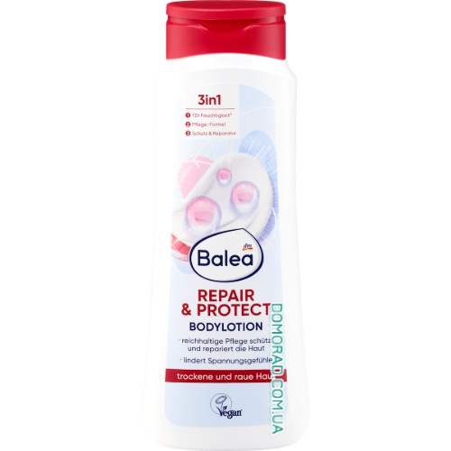 Лосьйон для тіла Repair & Protect від Balea пропонує комплексний догляд 3 в 1 для сухої та шорсткої шкіри: він забезпечує 72 години зволоження, інтенсивно захищає та відновлює шкіру. Формула з гліцерином та маслом ши може зменшити відчуття стягнутості та свербіж, пов'язаний з сухістю. Веганський лосьйон дерматологічно протестований та забезпечує відчуття доглянутої шкіри.