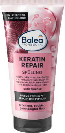Balea Professional Conditioner Keratin Repair заповнює ламкі ділянки та розгладжує поверхню волосся. Він зміцнює ослаблену структуру волосся, зменшує ламкість волосся, забезпечує оптимальне розчісування та меншу завивку. Будівельні блоки волосся, такі як кератин, зберігаються в структурі волосся, допомагають зміцнити волокна волосся та забезпечують покращену якість волосся. Для природного блиску та шовковистої гладкості.