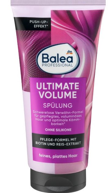Кондиціонер Ultimate Volume від Balea Professional може зробити тонке, плоске волосся густішим і слухняним завдяки ефекту пуш-ап. Невагома формула з біотином і екстрактом рису також забезпечує харчування та об'єм волосся, а також покращує їх розчісування. Balea Professional може зробити волосся помітно більш слухняним і безтурботним.