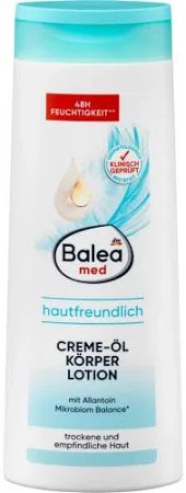 Крем-олія Balea MED - спеціальний засіб для догляду за сухою та грубою шкірою. Лосьйон для тіла забезпечує тривале зволоження до 48 годин. Алантоїн і гліцерин рослинного походження підтримують природну еластичність шкіри. Лосьйон для тіла підтримує баланс шкірної флори та сприяє збереженню неушкодженого шкірного бар’єру. **Доведено вимірюванням вологості шкіри на 20 суб’єктах після 2 тижнів використання двічі на день.