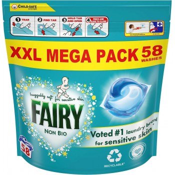 Капсули Fairy Non-Bio мають багатокамерну конструкцію, яка зберігає всі інгредієнти окремо доти, доки не досягне прання. Кожна капсула містить строго дозовану кількість миючого засобу, щоб білизна залишалася виключно м'якою для вашого тіла.