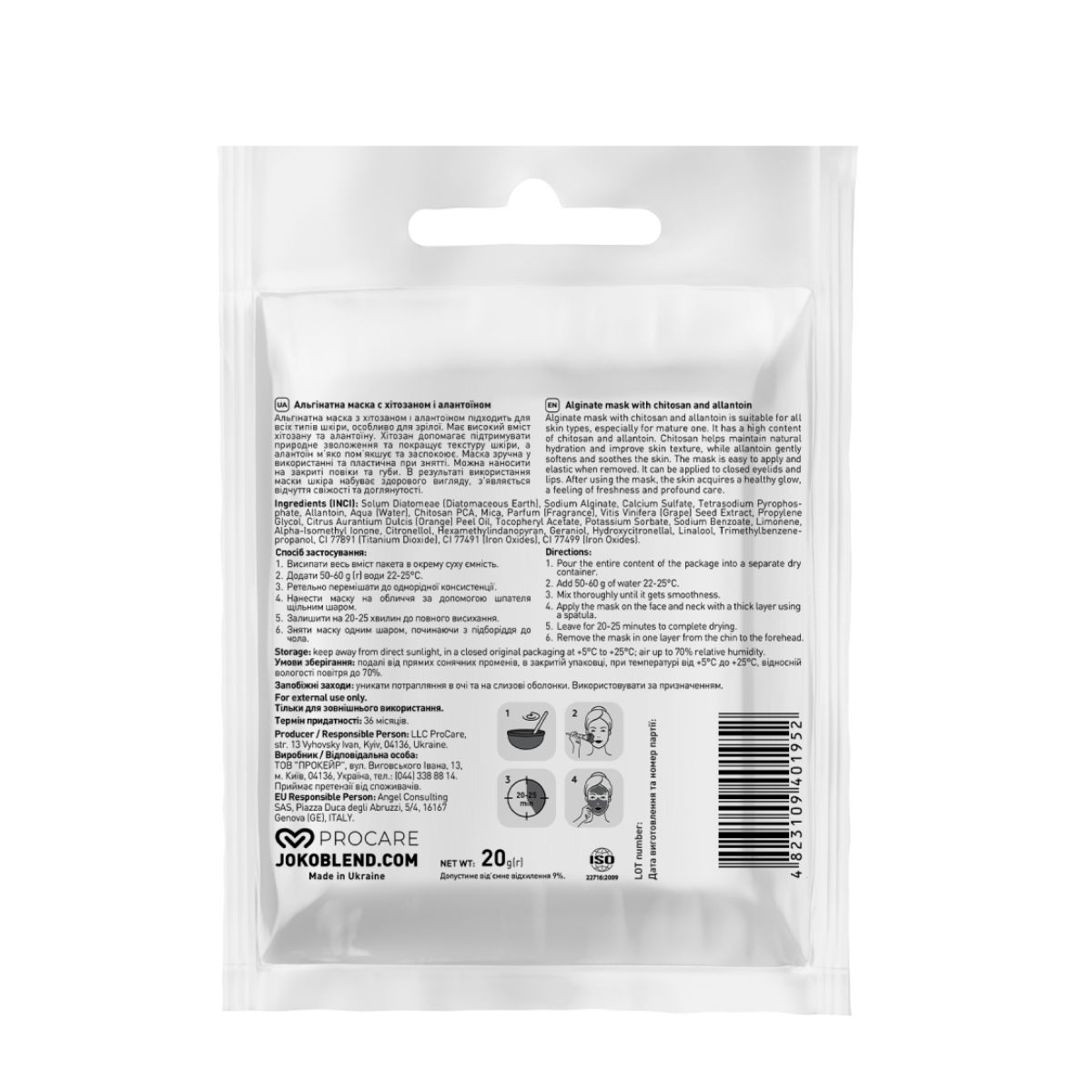 Антивікова альгінатна маска з хітозаном і алантоїном Joko Blend, 20 гАльгінатна маска з хітозаном і алантоїном Joko Blend — ефективний антивіковий догляд, що допомагає зберегти молодість і пружність шкіри. Вона ефективно бореться з ознаками старіння — глибоко зволожує, стимулює регенерацію клітин, покращує мікроциркуляцію й тонус шкіри. Завдяки натуральним компонентам шкіра стає гладкою, м'якою й сяйливою вже після першого застосування.Основні властивості:має антивіковий ефект; зменшує прояв зморщок; інтенсивно живить і зволожує шкіру; очищає пори, видаляє ороговілі клітини; покращує мікроциркуляцію й насичує шкіру киснем; усуває почервоніння, подразнення, пігментні плями; повертає пружність, еластичність і здоровий вигляд шкіри.Активні компоненти:хітозан — глибоко зволожує, утримує вологу в шкірі, уповільнює процеси старіння, сприяє загоєнню; алантоїн — заспокоює шкіру, усуває подразнення, стимулює регенерацію клітин, вирівнює тон і мікрорельєф; діатомова земля — очищає пори, м'яко відлущує, покращує кровообіг і тонус шкіри.Кому підходитьАльгінатна маска підходить для зрілої, сухої, тьмяної та втомленої шкіри з ознаками вікових змін. Ідеальний варіант для відновлення шкіри після стресу, нестачі сну або впливу зовнішніх чинників.Переваги:надає шкірі молодого, свіжого вигляду вже після першого застосування; покращує еластичність і зменшує видимість зморщок; сприяє загоєнню мікроушкоджень і зняттю подразнення; забезпечує ефект салонного догляду вдома; робить шкіру ніжною, гладкою та доглянутою.Спосіб використання:Розведіть вміст пакета водою кімнатної температури (50-60 мл) до стану густої сметани. Швидко нанесіть шпателем на очищене обличчя (можна на зону очей і губ) товстим шаром. Залиште до повного застигання (приблизно 20-25 хвилин). Зніміть маску одним рухом від підборіддя до чола. Змийте залишки водою й нанесіть зволожувальний крем або сироватку.Об'єм і форма випуску: Вага: 20 г Форма: Порошок для розведення водою в пакетику