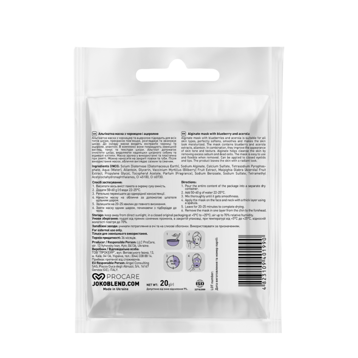 Альгінатна маска для шкіри обличчя Joko Blend з чорницею й ацеролою проти вікових змін, 20 гАльгінатна маска Joko Blend з чорницею й ацеролою — це ефективний антивіковий догляд, який допомагає шкірі залишатися молодою, свіжою та сяйливою. Вона покращує еластичність шкірного покриву, зволожує, стимулює регенерацію клітин і помітно згладжує дрібні зморшки.Натуральна формула збагачена антиоксидантами, що захищають шкіру від дії вільних радикалів, і, як наслідок, — від передчасного старіння.Основні властивості:бореться з проявами вікових змін і зменшує зморшки;