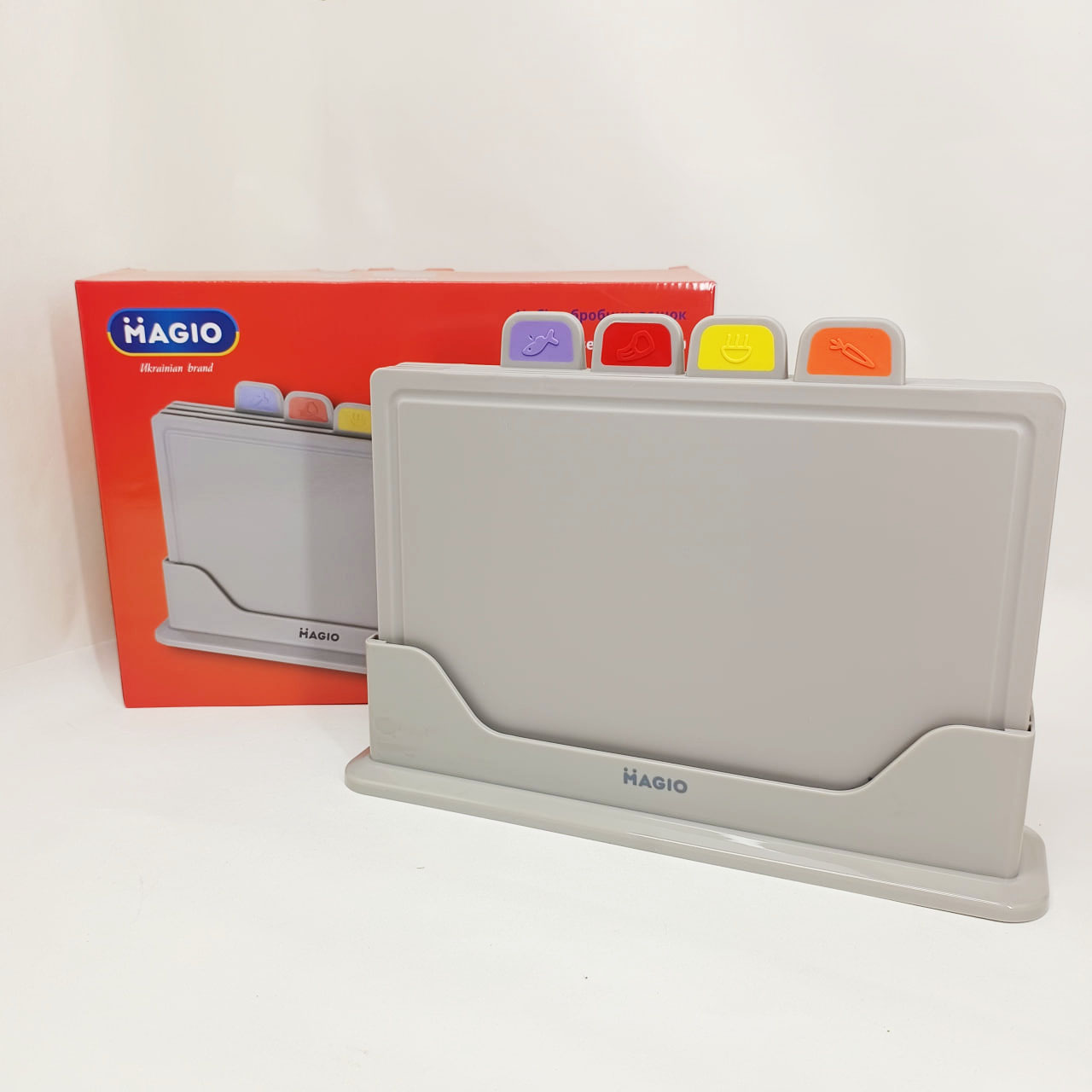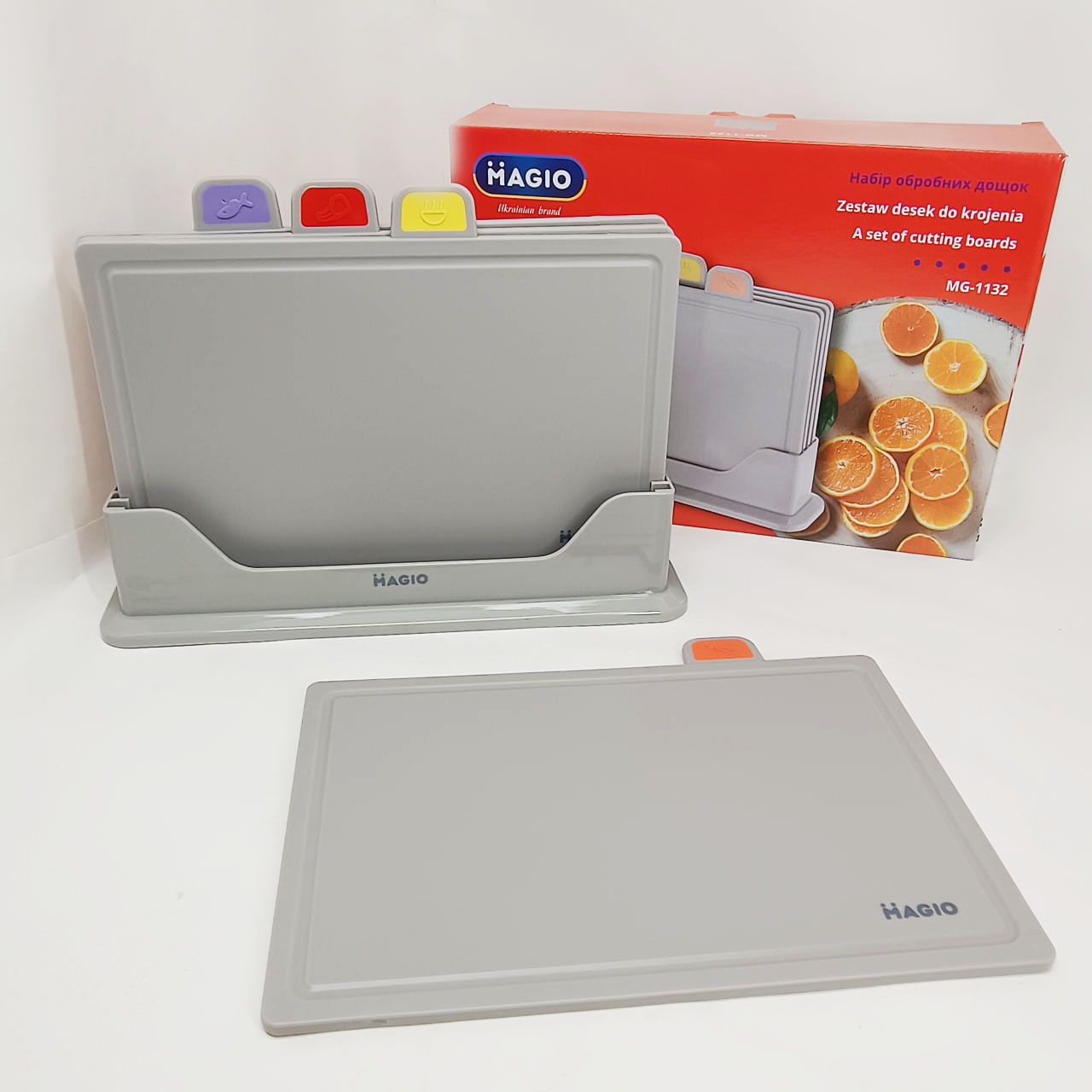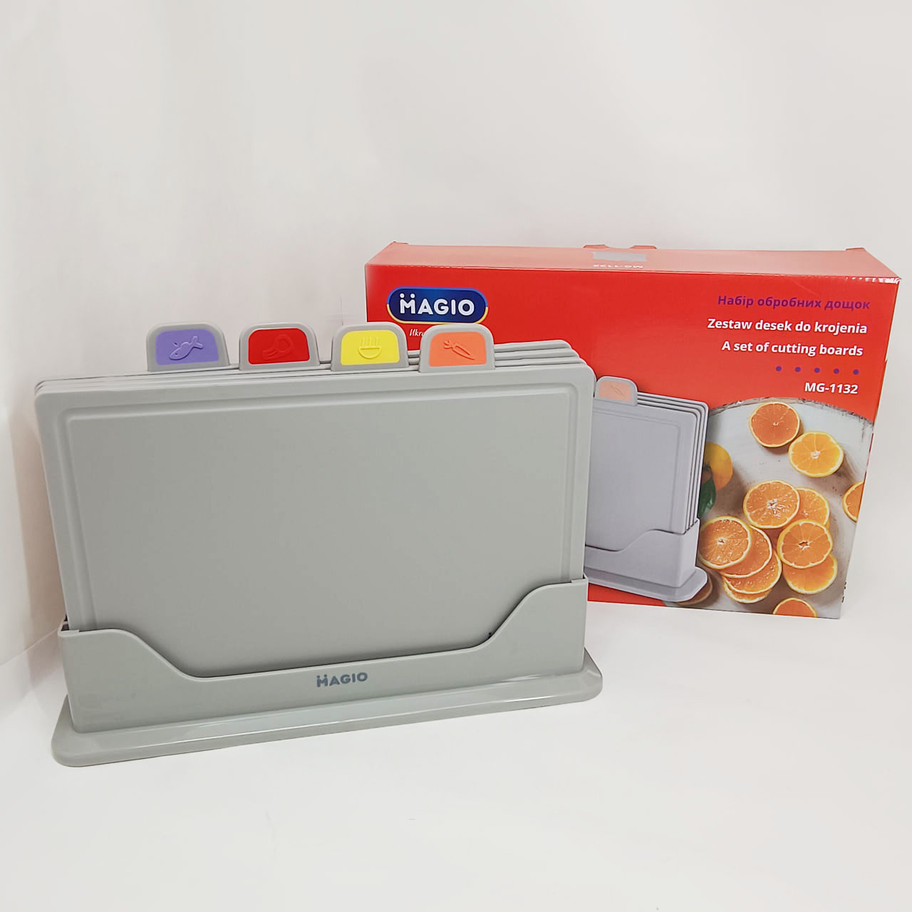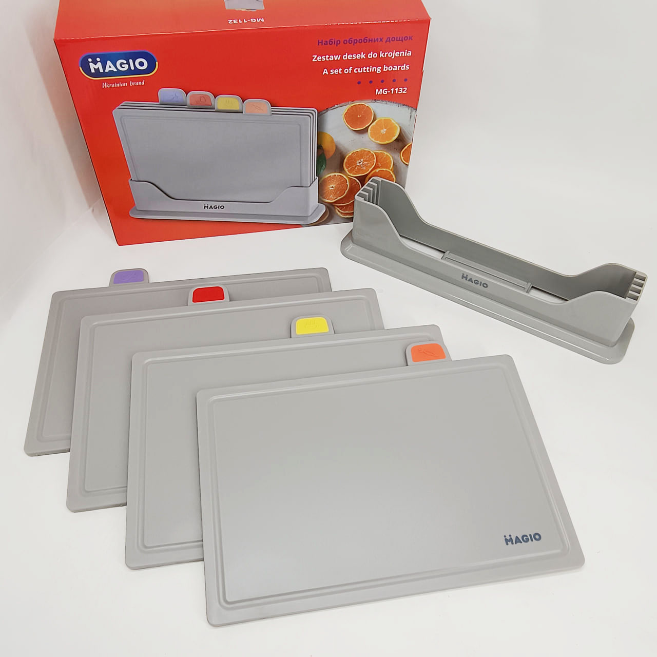- Комплект із чотирьох пластикових дощок, кожна з яких призначена для певного типу продуктів — риби, м’яса, овочів і гарячих страв.