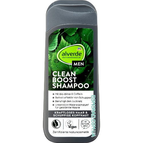 Сертифікований натуральний шампунь alverde MEN’s Clean Boost ефективно бореться з лупою, знімає свербіж і забезпечує відчуття свіжості надовго. До складу входять кофеїн та рослинний кератин, які стимулюють природний ріст волосся, зміцнюють його структуру та роблять його більш густим і здоровим. Інноваційна формула ніжно, але глибоко очищує волосся, не пересушуючи шкіру голови.