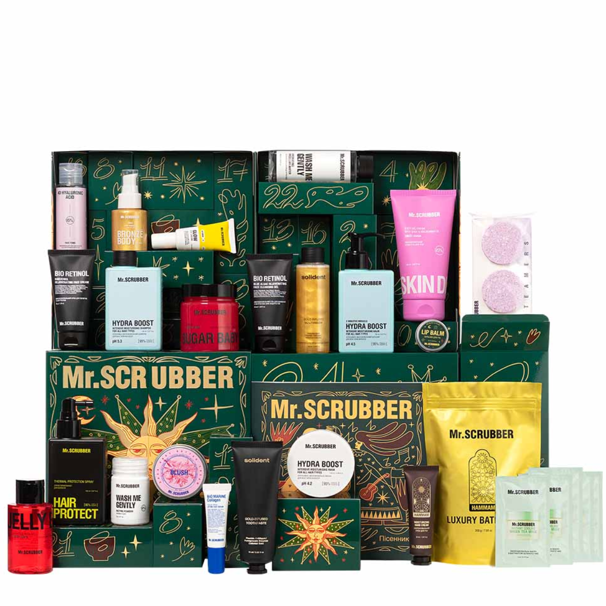 Адвент календар Mr.SCRUBBER Koliada для жінокАдвент-календар Mr.SCRUBBER “Koliada” — стильний та атмосферний подарунковий набір із зимовим настроєм. Усередині кожного віконця — улюблені б’юті-засоби бренду, які дарують турботу, аромат та святкову магію. Це ідеальний варіант для тих, хто обожнює косметичні сюрпризи й хоче зробити очікування свят ще приємнішим.Основні властивості:Косметичний адвент-календар з доглядовими засобами Преміальне подарункове оформлення у різдвяному стилі Підходить для жінок будь-якого віку Містить популярні засоби Mr.SCRUBBER у міні- та повнорозмірних форматах Створює святкову атмосферу й відчуття сюрпризуЩо входить до набору:Парфумована сіль для ванни Hammam, 200 g Зволожувальний крем-гель для тіла SKIN DELIGHTS, 150 ml Ароматична таблетка для душу Deep Relax, 50 g Інтенсивно зволожувальна маска для всіх типів волосся Hydra Boost, 100 ml Крем-батер для тіла Blush, 35 g Інтенсивно зволожувальний бальзам для всіх типів волосся 2 Minutes Miracle: Hydra Boost, 150 ml Ополіскувач для ротової порожнини SOLIDENT GOLD-INFUSED MOUTHWASH із колоїдним золотом, 100 ml Бальзам для губ Lip Balm, 10 ml Гель для душу Cherry Bomb Jelly Bubbles, 100 ml Висвітлювальний крем для шкіри навколо очей зі стабільним вітаміном С, 15 ml Скраб для тіла Cherry Bomb SUGAR BABY, 250 g Ліфтинг сироватка для обличчя з колагеном і клітинною водою Bio Marine Collagen, 10 ml Ензимна пудра WASH ME GENTLY, 20 g Набір охолоджувальних масок для обличчя Instant Cooling Green Tea Mask Set з екстрактом зеленого чаю, 7 саше / 10 ml Зволожувальний тонік для обличчя 4D Hyaluronic Acid з 4Д гіалуроновою кислотою, 80 ml Зубна паста SOLIDENT GOLD-INFUSED TOOTHPASTE з колоїдним золотом, 75 ml Термозахисний спрей для волосся Bronze Body, 150 ml Омолоджувальний гель для вмивання Bio Retinol з екстрактом синіх водоростей, 50 ml Інтенсивно зволожувальний шампунь для всіх типів волосся Hydra Boost, 150 ml Омолоджувальний крем для обличчя Bio Retinol з бакучіолом, 50 ml Міцелярна вода з ефектом зволоження WASH ME GENTLY, 100 ml Зволожувальний крем для рук Hammam, 30 ml Шимер для тіла Gold Bronze Body, 50 ml Пісенник KoliadaАктивні компоненти:Натуральні олії та екстракти — живлення та пом’якшення Зволожувальні комплекси — підтримка пружності шкіри Ароматичні есенції — створюють зимовий настрійДля кого підходить:Для любителів косметичних сюрпризів Для жінок будь-якого віку Як святковий подарунок для друзів, мами, колег чи близьких Для щоденної передсвяткової радостіЧому варто купити жіночий адвент-календар Mr. Scrubber “Koliada”готовий подарунок у святковому оформленні; атмосферний дизайн у стилі української коляди; містить набір якісної натуральної косметики для обличчя та тіла; створює святковий настрій на кожен день.Спосіб застосування Відкривайте одне віконце щодня. Користуйтеся косметичними засобами відповідно до призначення. Насолоджуйтесь ароматами та щоденним передсвятковим сюрпризом.Об’єм і форма випуску23 косметичні засоби у подарунковому бьюті-боксі, збірних різдвяних колядок