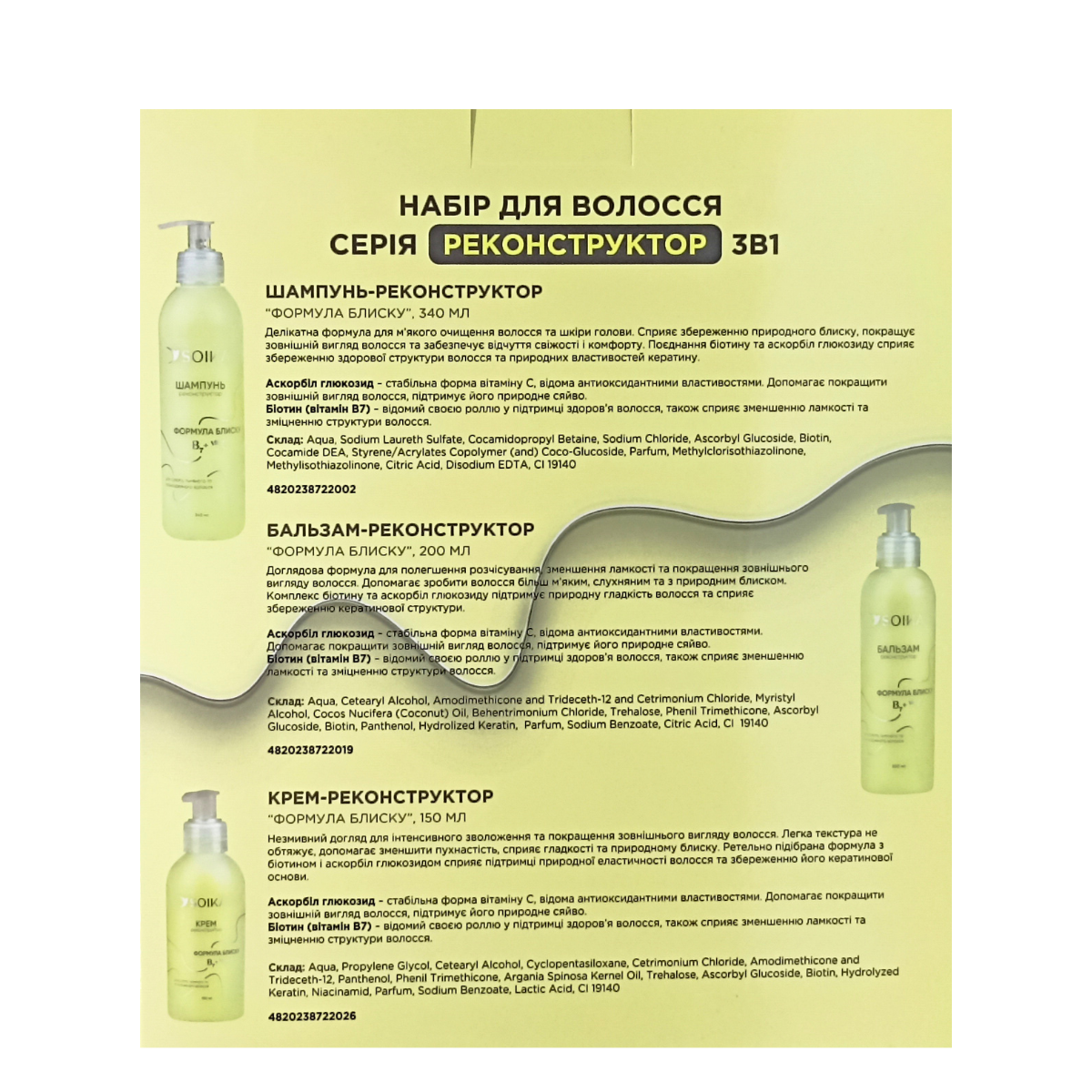 | Склад набору | Шампунь|Кондиціонер для волосся|Крем для волосся |