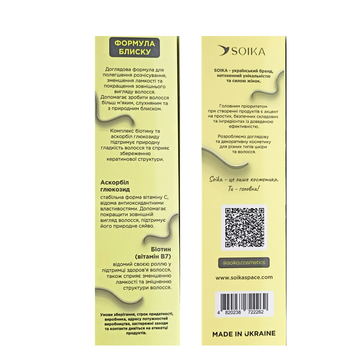 тьмяного, пористого волосся; тонкого, ослабленого й схильного до випадіння.Ефект від використанняРегулярно застосовуючи комплекс Soika "Формула блиску" ви швидко побачите довгоочікуваний результат:гладке, м’яке та шовковисте волосся;