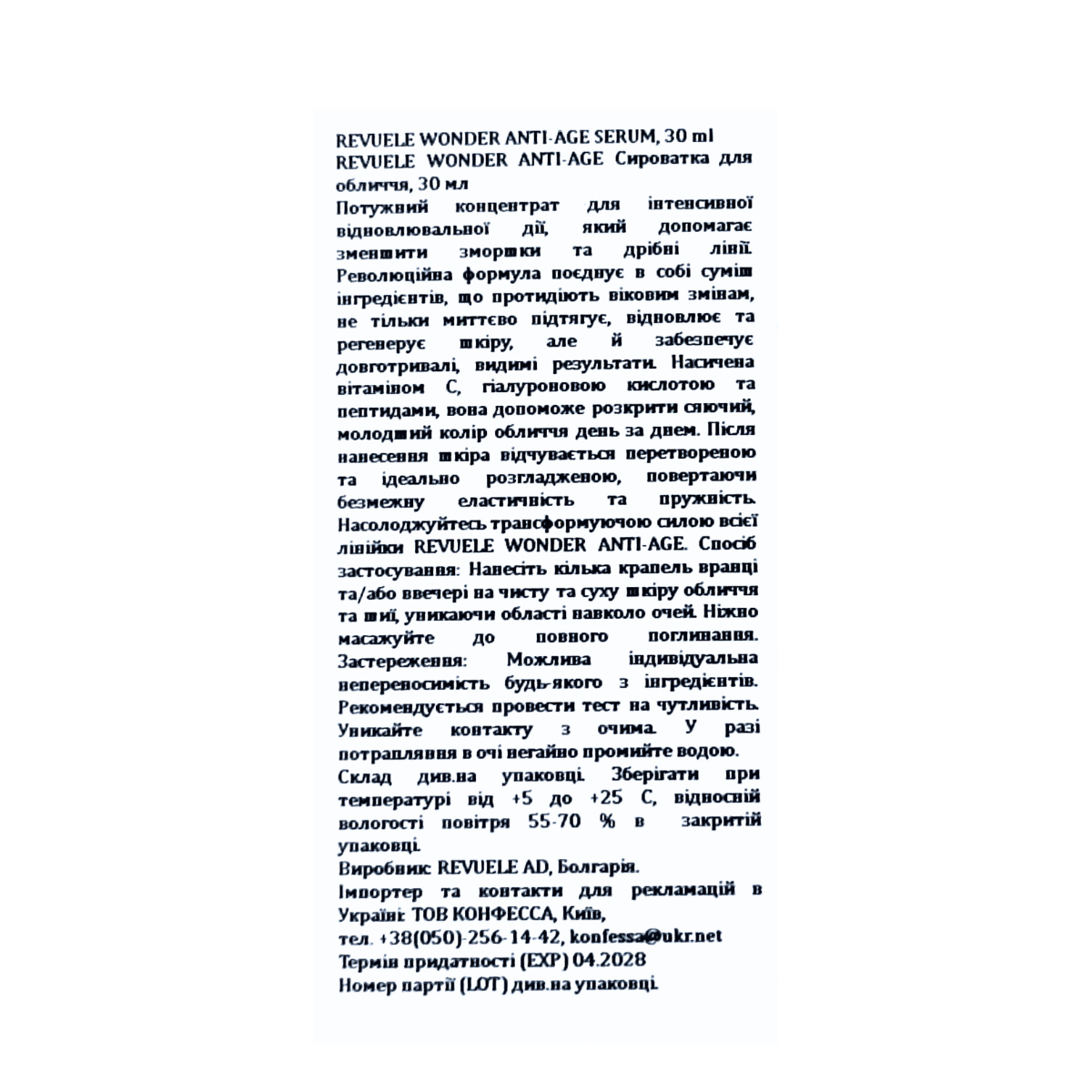 Антивікова сироватка для обличчя Revuele Wonder Anti-Age Serum з пептидамиОмолоджувальна сироватка Revuele Wonder Anti-Age - це концентрований засіб проти зморщок, створений для глибокого відновлення та підвищення пружності шкіри. Серум забезпечує комплексну дію: миттєво зволожує, розгладжує та освітлює, а також забезпечує довготривалий антивіковий ефект. Шкіра стає помітно гладенькою, сяючою та оновленою вже після кількох застосувань.Активні компоненти:ніацинамід (Вітамін B3) - вирівнює тон, зміцнює бар'єр шкіри; вітамін С - потужний антиоксидант, стимулює синтез колагену, освітлює; гіалуронова кислота (Гіалуронат натрію) - забезпечує глибоке зволоження; пептиди (трипептид-1, тетрапептид-7) - стимулюють регенерацію і підтягують шкіру; провітамін B5 (пантенол) заспокоює, зменшує сухість; протеїни пшениці та сої — зміцнюють структуру шкіри; екстракт водоростей — покращує текстуру шкіри.Кому підходитьСерум ідеальний для боротьби проти вікових змін у всіх типів шкіри. Особливо рекомендований для зрілої, тьмяної шкіри, зі зниженим тонусом і видимими ознаками старіння. Для тих, хто бажає інтенсивного омолоджувального догляду з довготривалим ефектом.Ефект від застосуванняРезультат при регулярному використанні пептидного серуму для обличчя:розгладжує зморшки та зменшує видимість дрібних ліній; підвищує пружність і еластичність шкіри; інтенсивно зволожує та утримує вологу; покращує тонус, освітлює тьмяний колір обличчя; захищає шкіру від оксидативного стресу та старіння.Спосіб використанняНанесіть кілька крапель сироватки на чисту суху шкіру обличчя та шиї вранці та/або ввечері, уникаючи зони навколо очей.Акуратно вмасуйте до повного поглинання.Рекомендується провести тест на чутливість перед використанням.Об'єм і форма випуску 30 мл, флакон зі зручним дозатором-піпеткою.