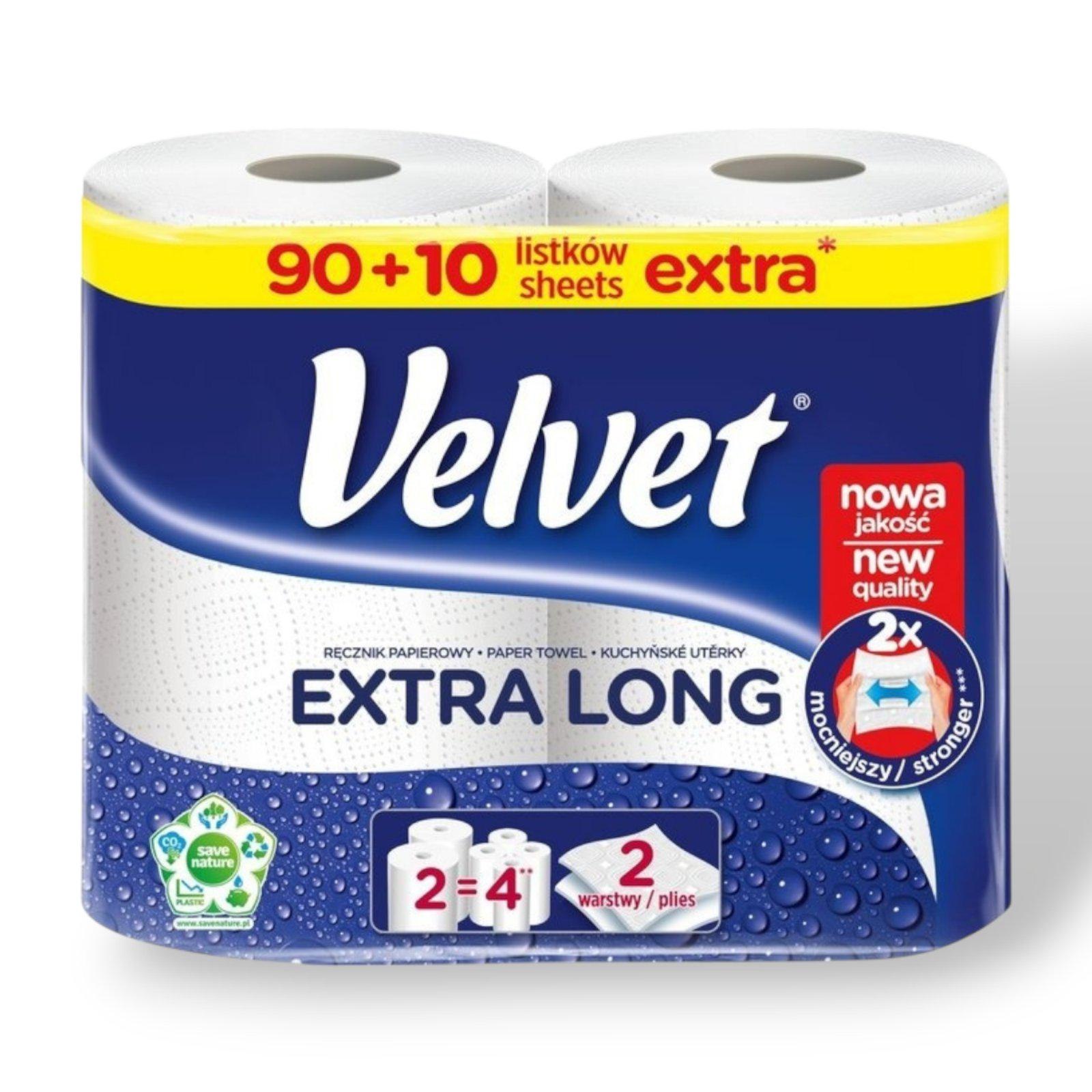 Рушники паперові Velvet Extra Long мають два шари, що надає їм відмінну міцність та високу поглинання. Кожен рулон складається зі 100 листків, розмір кожного листа — 22 х 23 см. Упаковка містить два рулони (200 листків), що робить цей продукт зручним та економічним для використання на кухні чи в побуті. Папір має атестат ПЗ та ідеально підходить для щоденного прибирання та витирання рідини.