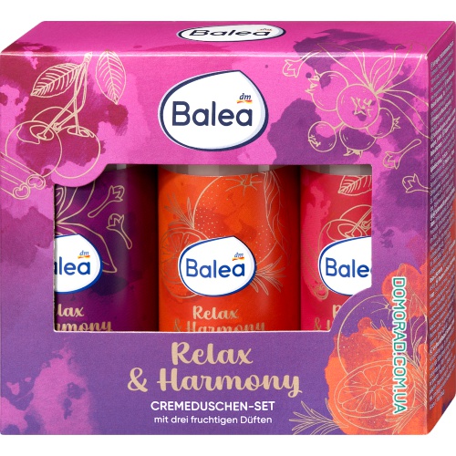 Подарунковий набір Balea Relax & Harmony із 3 предметів пропонує зимовий фруктовий релакс для особистого оздоровчого відпочинку. З трьома кремовими гелями для душу із заспокійливими фруктовими ароматами, набір забезпечує винятковий досвід прийняття душу, який балує тіло та почуття. Ніжні формули ніжно очищають шкіру, залишаючи її оксамитово гладенькою. Ідеально підходить, щоб забути про щоденний стрес та подарувати собі трохи відпочинку.