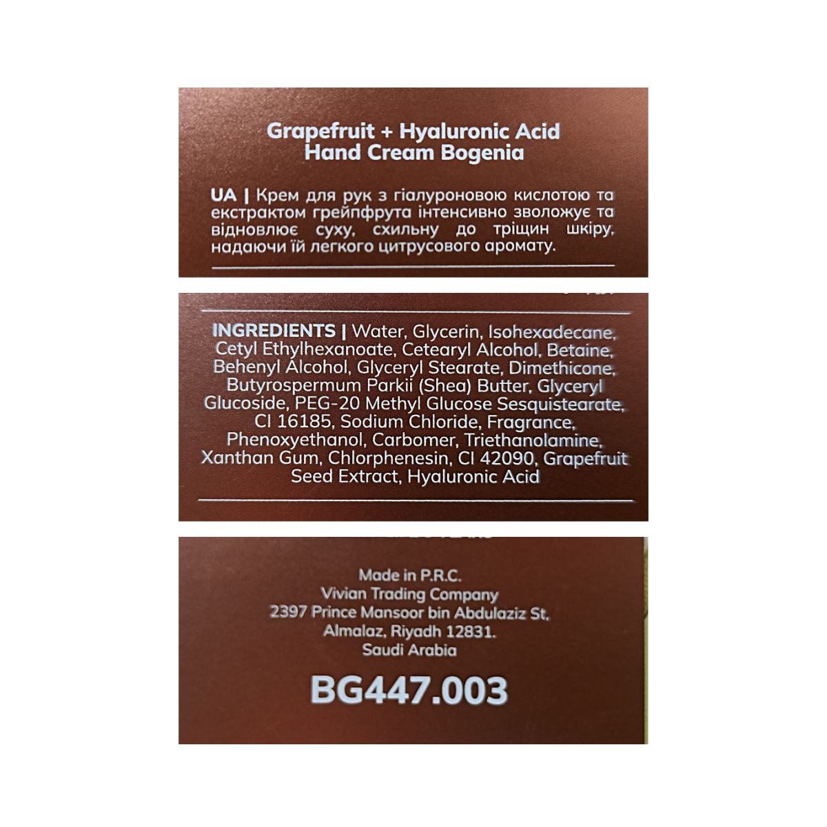Відновлювальний крем для дуже сухої, потрісканої шкіри рук Bogenia Grapefruit + Hyaluronic Acid Hand Cream з гіалуроновою кислотоюВідновлювальний крем для дуже сухої та потрісканої шкіри рук Bogenia Grapefruit + Hyaluronic Acid - це інтенсивна формула, створена для глибокого зволоження, пом'якшення та регенерації. Завдяки гіалуроновій кислоті та екстракту грейпфрута крем швидко поглинається, усуває шорсткість і допомагає відновити комфорт навіть дуже подразненої шкіри.Основні властивостіДія крему на шкіру рук:інтенсивно зволожує і підтримує водний баланс шкіри рук;