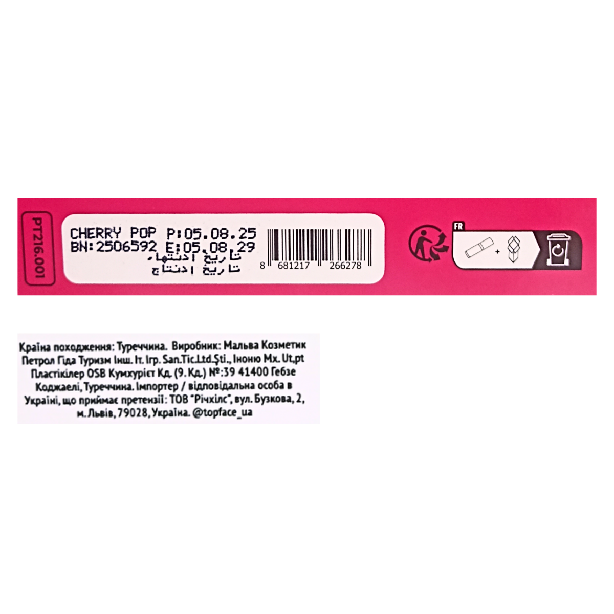 Олія для збільшення об'єму губ TopFace Lip Glow Oil Plump Effect, 4 г (PT216), 01 Cherry Pop Вишневий аромат. Зображення №2 Олія для збільшення об'єму губ TopFace Lip Glow Oil Plump Effect, 4 г (PT216), 01 Cherry Pop Вишневий аромат. Зображення №3