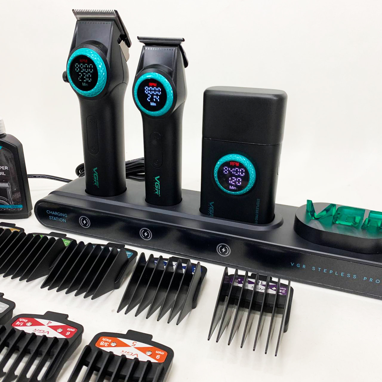 Професійний набір для барберів VGR Stepless Pro 3 in 1 BLACK включає три повноцінні інструменти: машинку для стрижки, триммер та електробритву з подвійною сіткою. Всі пристрої оснащені потужними щілинними двигунами BLDC і LED-дисплеями, які відображають оберти і рівень заряду. Великий вибір насадок від 1 до 24 мм робить комплект максимально універсальним для будь-яких видів стрижок. Набір поставляється із зручною зарядною станцією, що дозволяє розміщувати та заряджати всі три прилади одночасно. Металеві леза, професійна комплектація та висока точність різу роблять комплект ідеальним для салонів та домашнього застосування.