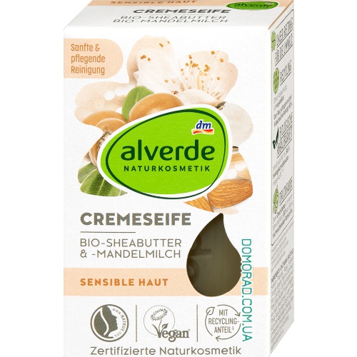 Крем-мило з органічним маслом ши та органічним мигдальним молоком від alverde NATURAL COSMETICS забезпечує ніжне очищення. Формула з маслом ши та мигдальним молоком підтримує природний баланс шкіри. Для щоденного очищення.