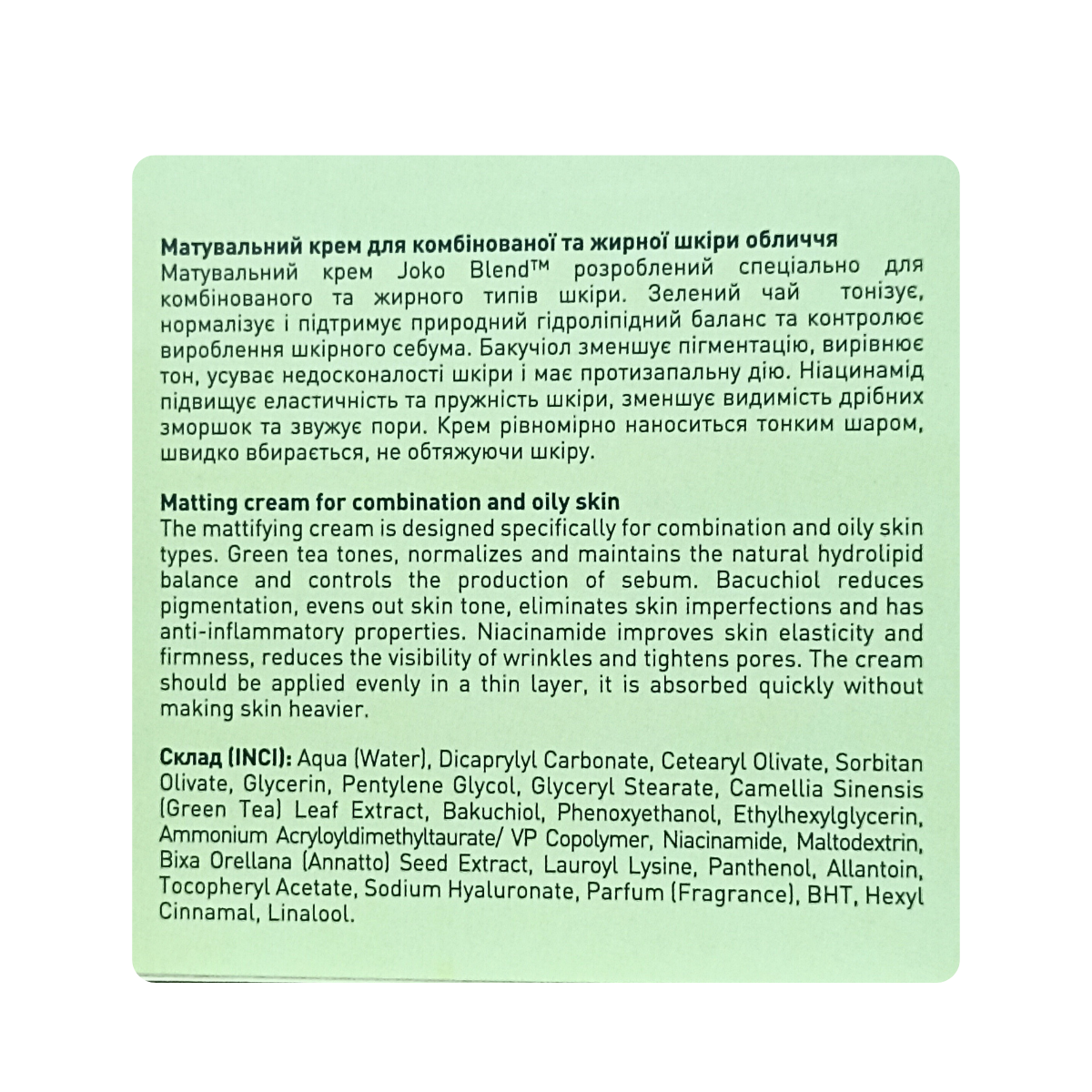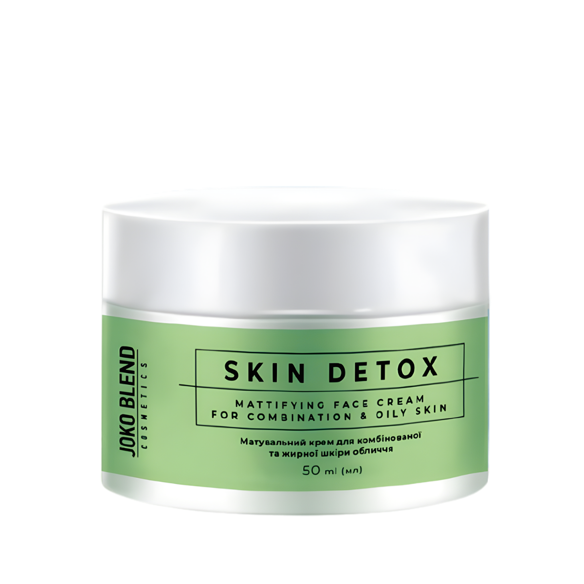 Матувальний крем для жирної та комбінованої шкіри Joko Blend Skin Detox - з бакучіолом, ніацинамідомМатувальний крем для обличчя Joko Blend Skin Detox розроблений спеціально для догляду за жирною та комбінованою шкірою. Формула допомагає контролювати вироблення себума, зменшує недосконалості — кількість прищів, акне — та підтримує природний гідроліпідний баланс шкіри.Крем легко розподіляється тонким шаром, швидко поглинається та не обтяжує шкіру, залишаючи матовий фініш та доглянутий вигляд.Основні властивостіЯк працює:матує шкіру та контролює жирний блиск;