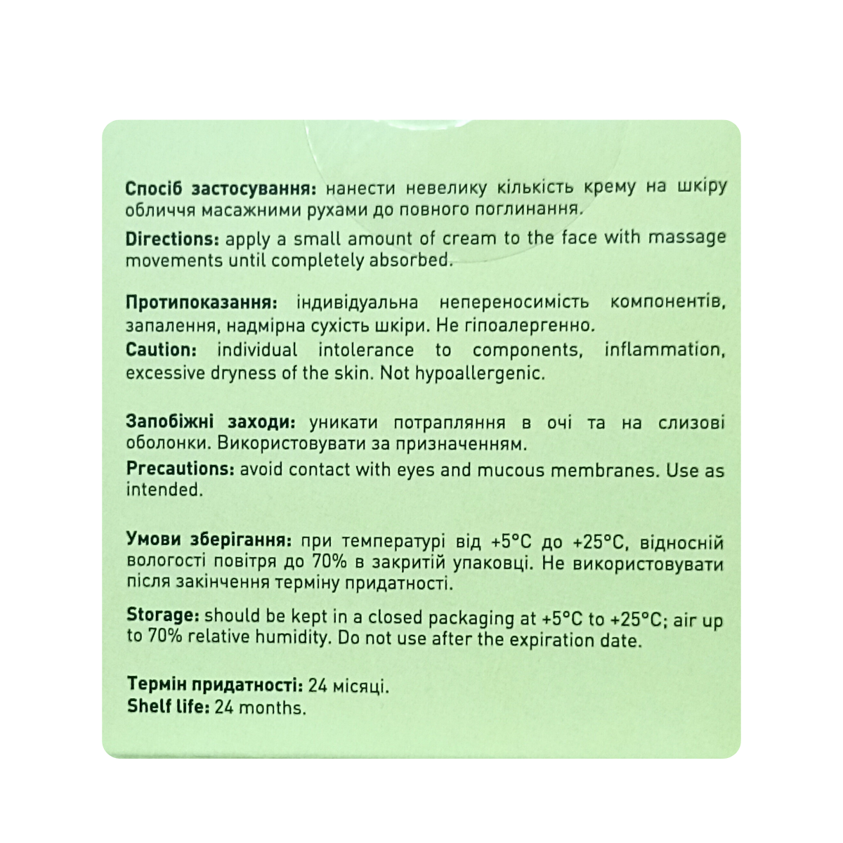 підвищена еластичність і комфорт шкіри.Спосіб використанняНанесіть крем на очищену шкіру обличчя.
