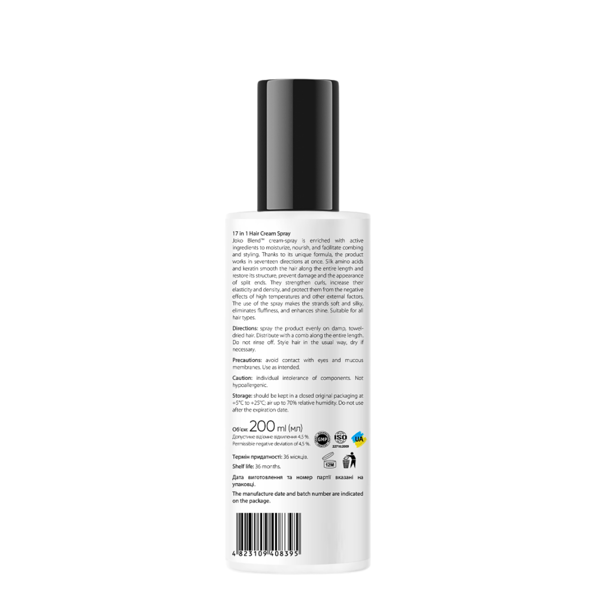 Крем-спрей для волосся 17 в 1 Joko Blend™ з кератином та амінокислотами шовку, незмивнийКрем-спрей 17 в 1 Joko Blend™ — багатофункціональний засіб для комплексного догляду за сухим, пористим і неслухняним волоссям. Він миттєво зволожує, відновлює і захищає пасма, робить їх гладкими, блискучими та доглянутими без обтяження. Засіб також захищає волосся від впливу високих температур під час укладання феном, плойкою.Основні властивості1 засіб = 17 дій:Глибоко зволожує.