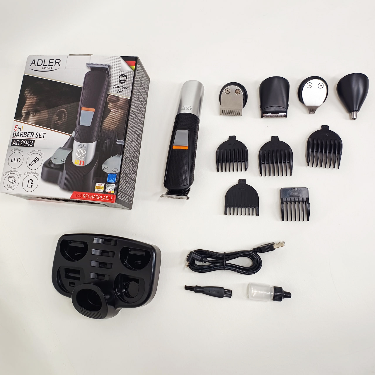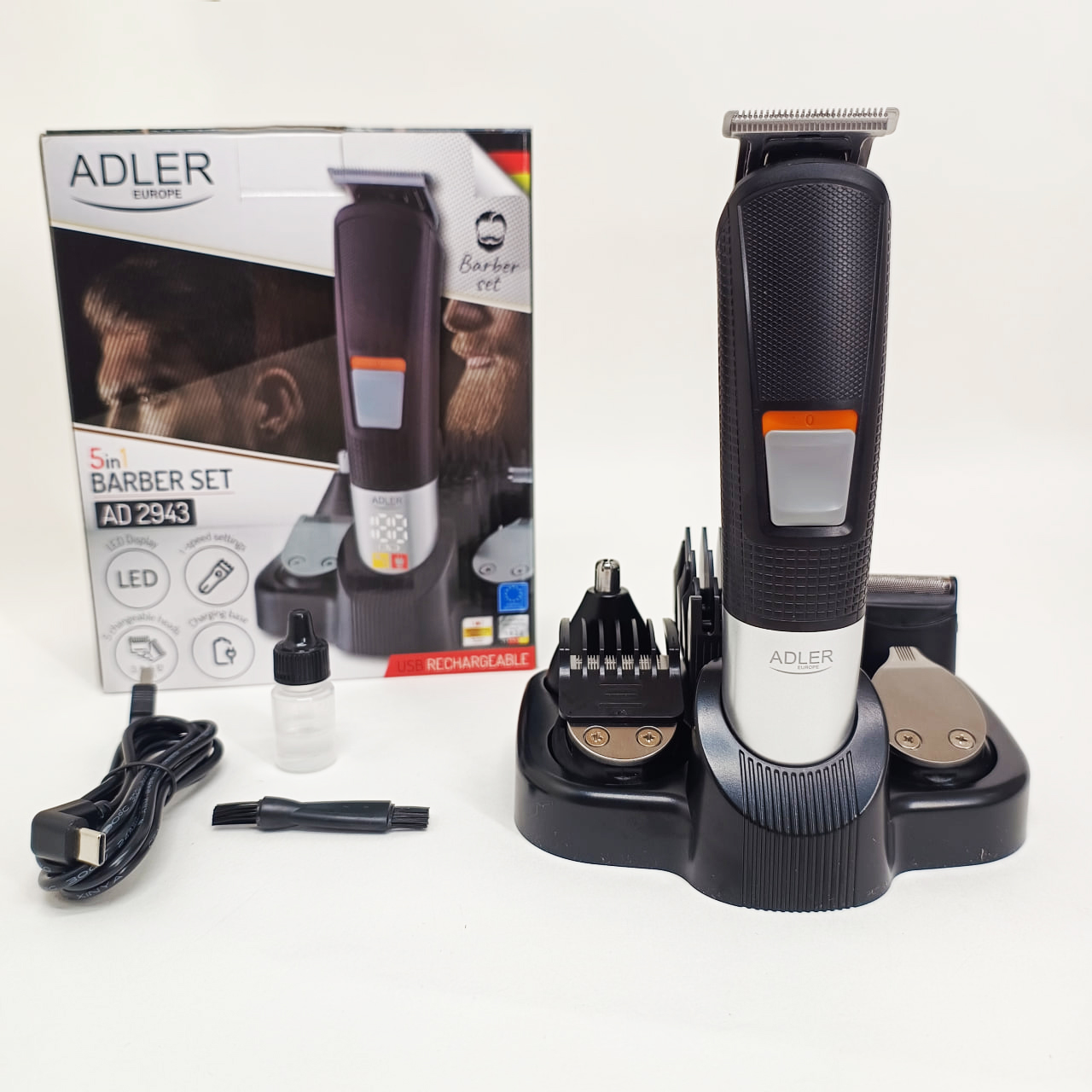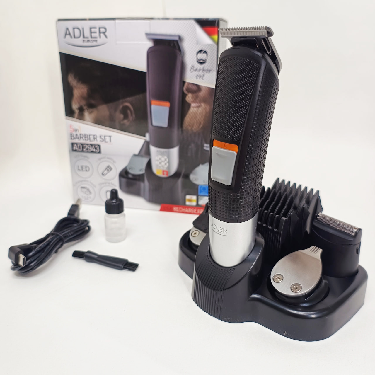 Adler AD 2943 – універсальний набір по догляду за волоссям та бородою, що поєднує п’ять змінних головок в одному пристрої. Ідеальне рішення для чоловіків, які цінують ефективність та зручність щоденного догляду.