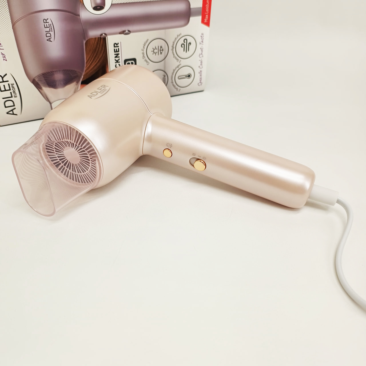 - 2 рівні сили видування: можливість регулювати силу видування відповідно до потреб користувача, що забезпечує щадне сушіння або швидше укладання.