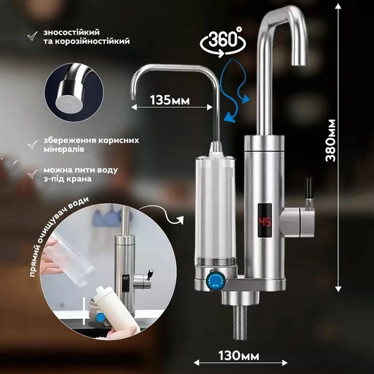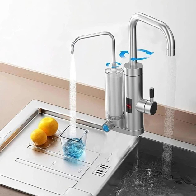 Водонагрівач обладнаний двома кранами, один з яких має вбудований нагрівальний елемент, здатний нагріти воду всього за 3 секунди і підтримувати задану температуру протягом тривалого часу, а другий кран обладнаний багатоступеневим фільтром для очищення води, цей пристрій гарантує отримання як гарячої, так і чистої води у вашому будинку.