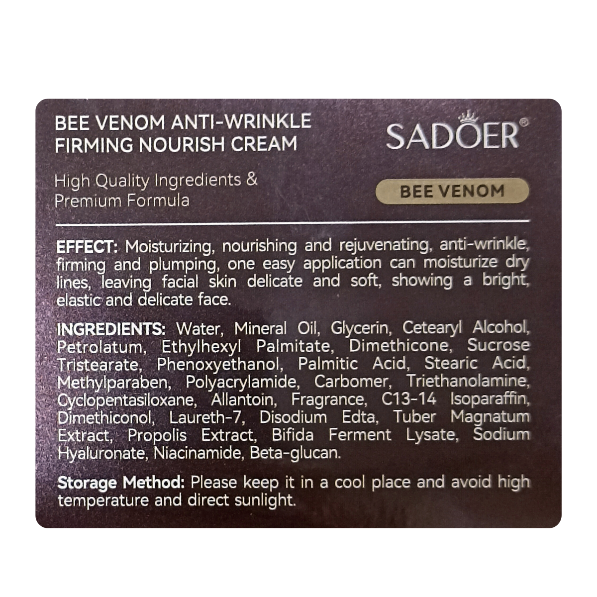 Омолоджувальний крем для обличчя Sadoer Bee Venom — з бджолиною отрутою, ніацинамідом, гіалуроновою кислотоюОмолоджувальний крем для обличчя Sadoer Bee Venom створений для комплексного догляду за шкірою з ознаками вікових змін. Формула з бджолиною отрутою, ніацинамідом та гіалуронатом натрію зволожує, живить і допомагає зменшити вираженість зморшок, повертаючи шкірі пружність і здорове сяйво.Основні властивостіЯк працює:інтенсивно зволожує та заповнює сухі лінії;