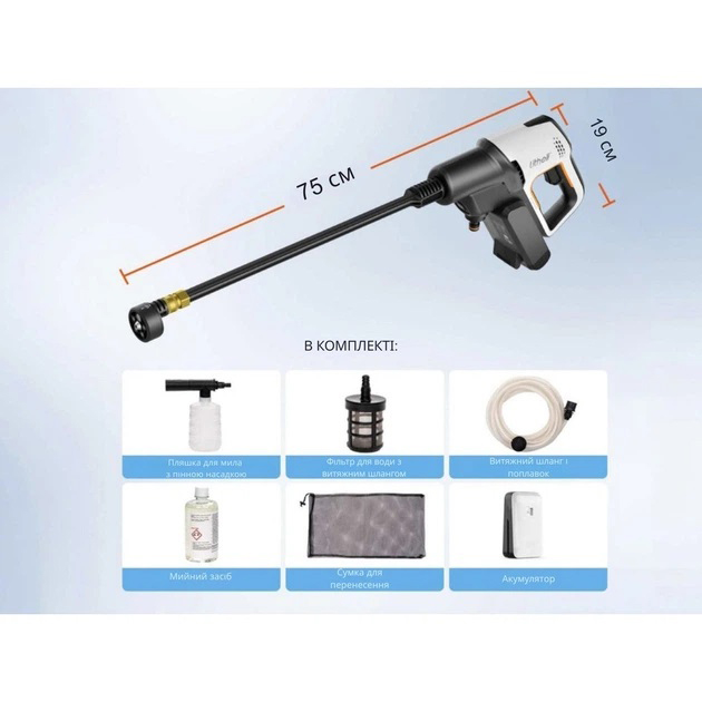 УМБ Litheli Power Bank 20000 mAг, Розпилювальна трубка, Адаптер для насадки, Багатофункціональна насадка 5-в-1, Фільтр для шланга, Пляшка для мила з пінною насадкою, Всмоктувальний шланг (6 м), Мийний засіб / Миючий засіб, Сумка для перенесення, Інструкція користувача