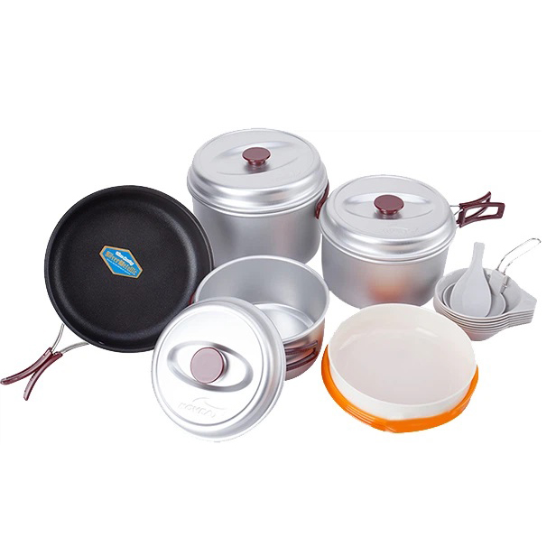 Набір легкого похідного посуду з алюмінію Kovea KSK-WY78 Silver 78, розрахований на сім-вісім осіб. Набір складається з трьох каструль об’ємом 4,2 літра, 2,8 літра і 1,8 літра, зручної сковороди, 4 тарілок, 5 чашок, судка, друшляка, лопатки і складного черпачка. Каструлі і сковорода не мають пластикових деталей, у зв’язку з чим їх можна легко ставити на відкритий вогонь або в вугілля, не побоюючись оплавлення і деформації.