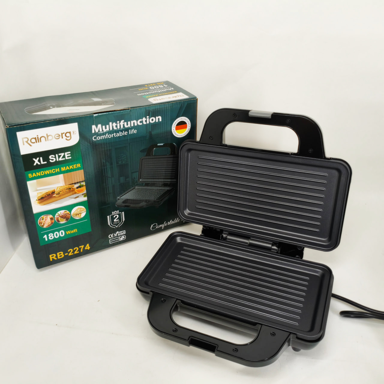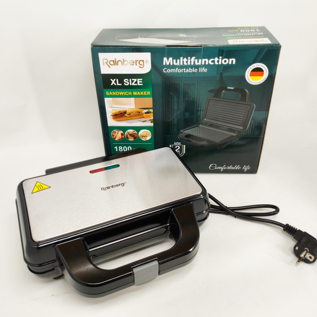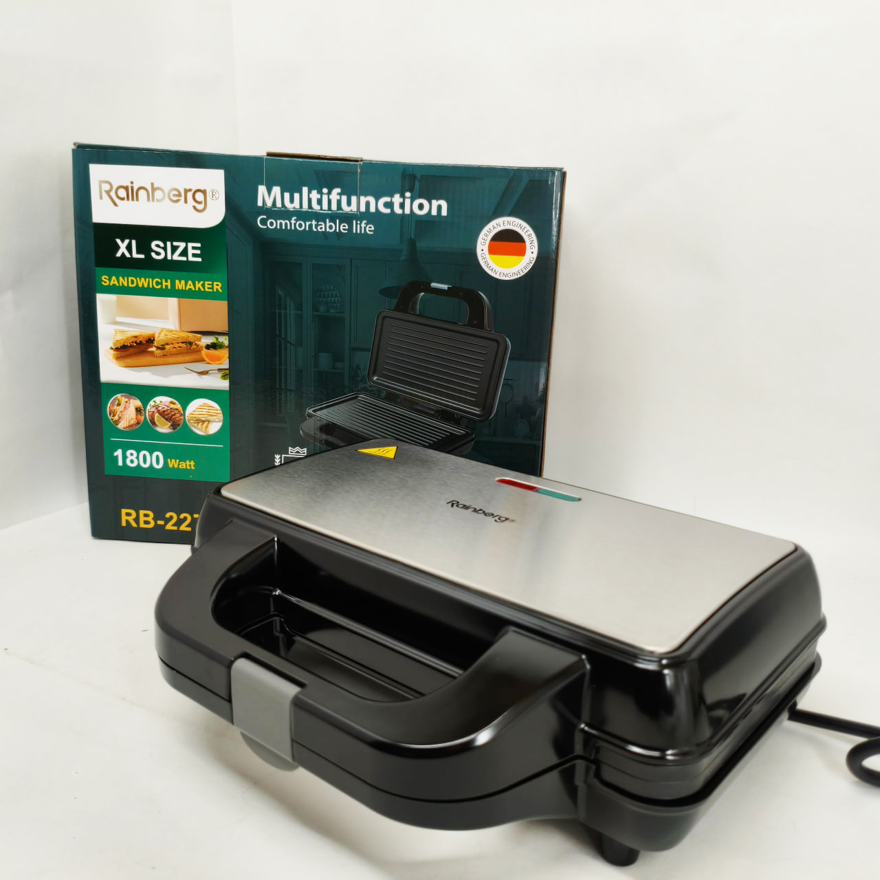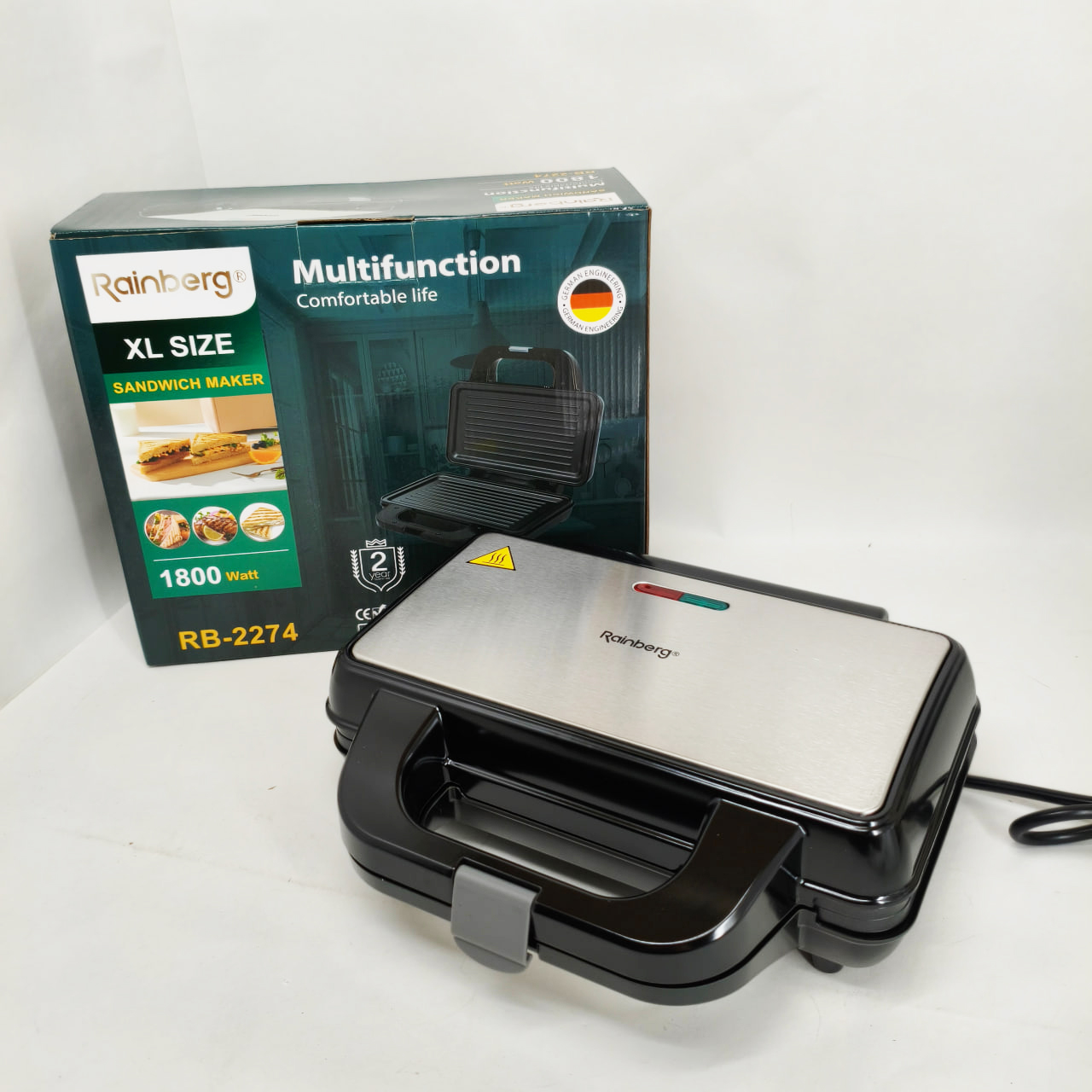 Електрогриль Rainberg RB-2274 – це універсальне рішення для приготування різноманітних страв із збереженням смаку та текстури. Завдяки потужності 1800 Вт він забезпечує швидкий і рівномірний нагрів до 230°C, що дозволяє смажити м’ясо, овочі, готувати гарячі бутерброди, піцу та підгрівати вже готові страви без зайвих зусиль. Надійна конструкція з металевого корпусу в поєднанні з зручним механічним керуванням роблять експлуатацію приладу комфортною і простою для щоденного використання.