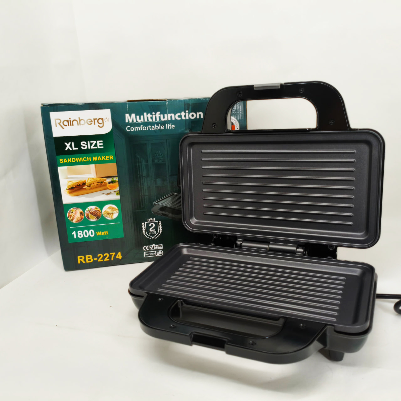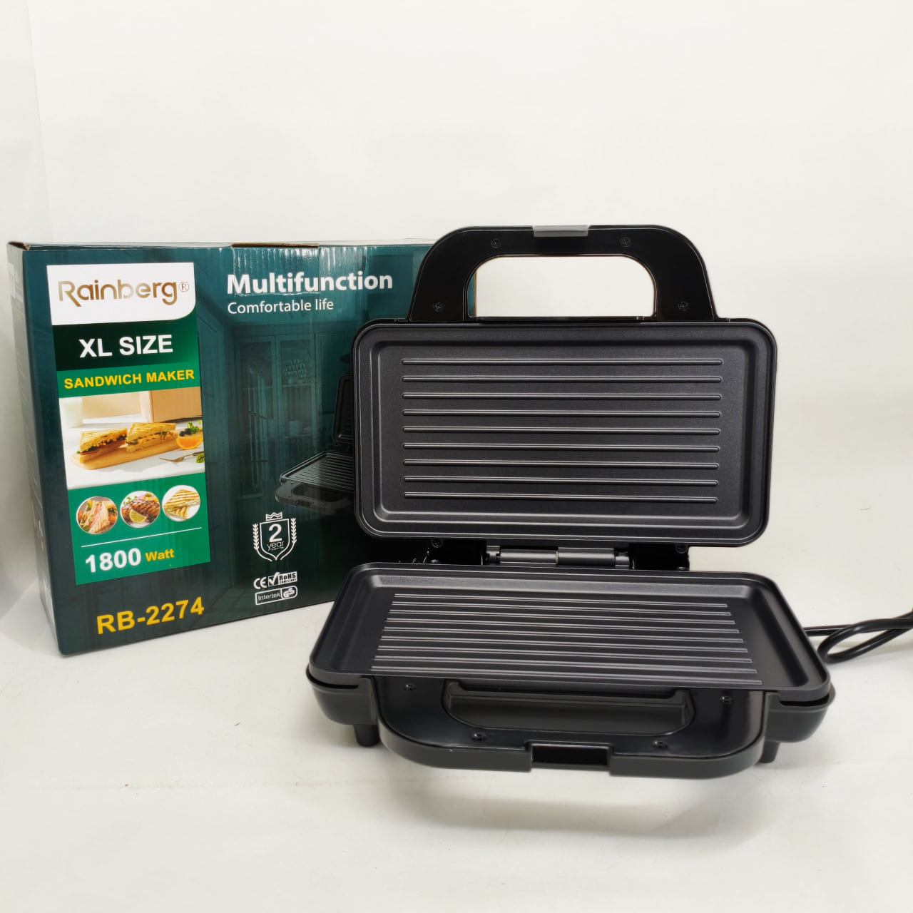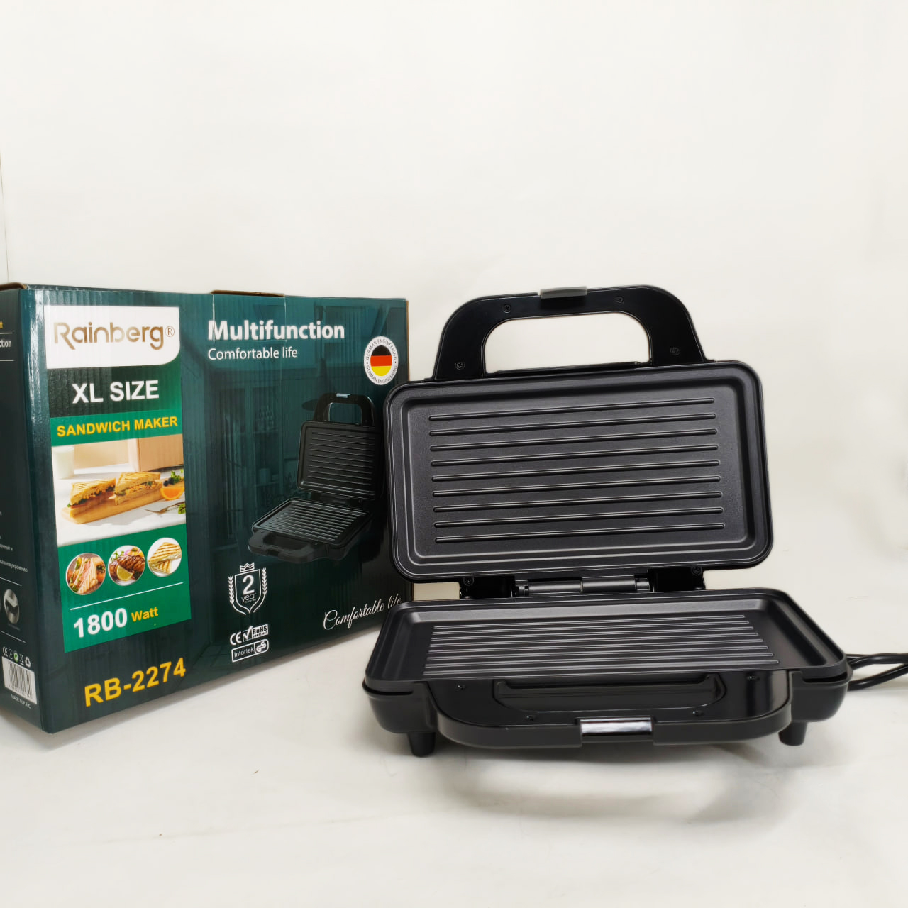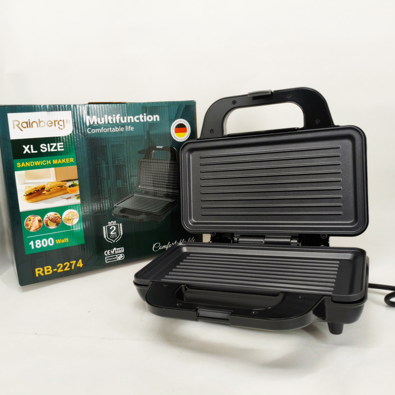 Електрогриль Rainberg RB-2274 – це універсальне рішення для приготування різноманітних страв із збереженням смаку та текстури. Завдяки потужності 1800 Вт він забезпечує швидкий і рівномірний нагрів до 230°C, що дозволяє смажити м’ясо, овочі, готувати гарячі бутерброди, піцу та підгрівати вже готові страви без зайвих зусиль. Надійна конструкція з металевого корпусу в поєднанні з зручним механічним керуванням роблять експлуатацію приладу комфортною і простою для щоденного використання.