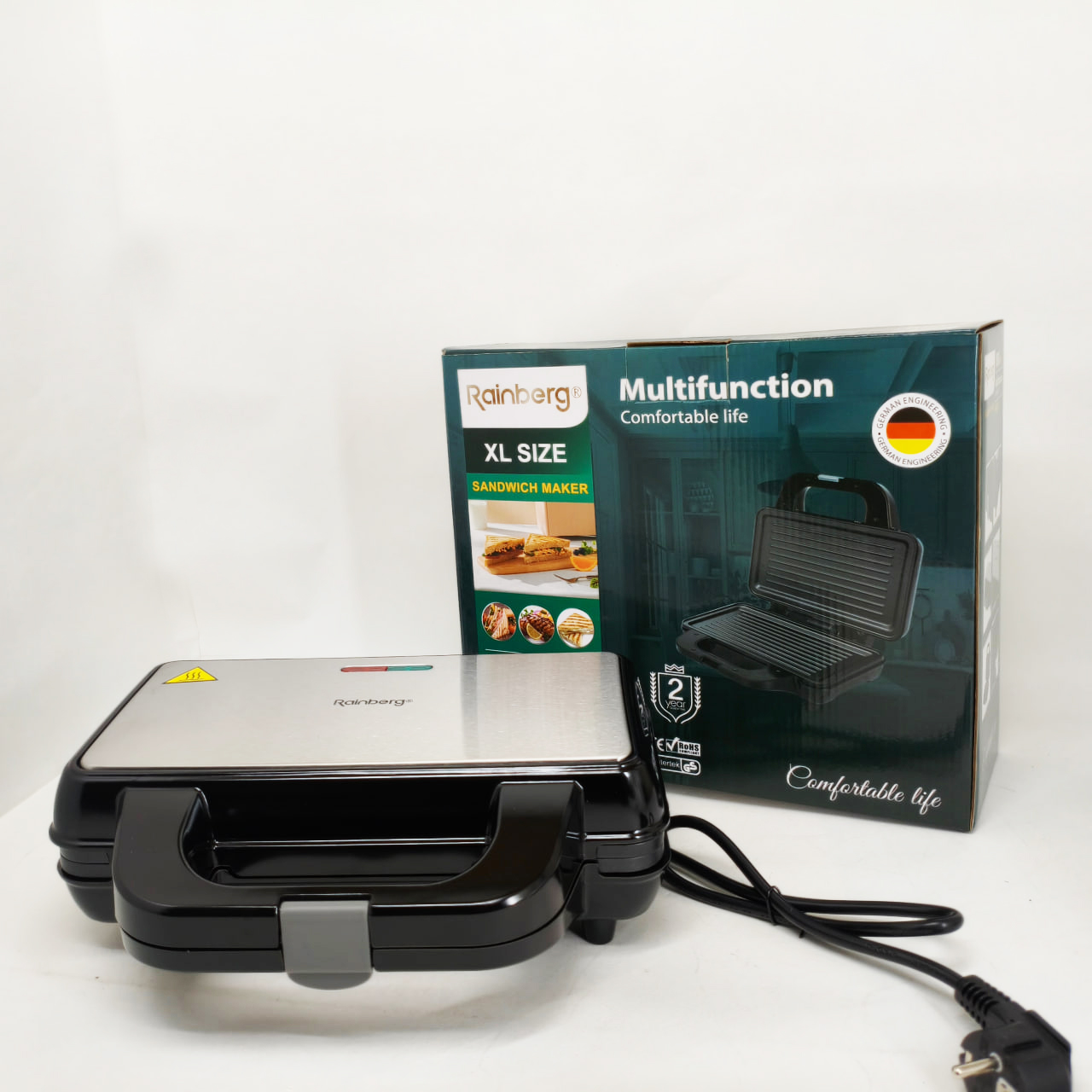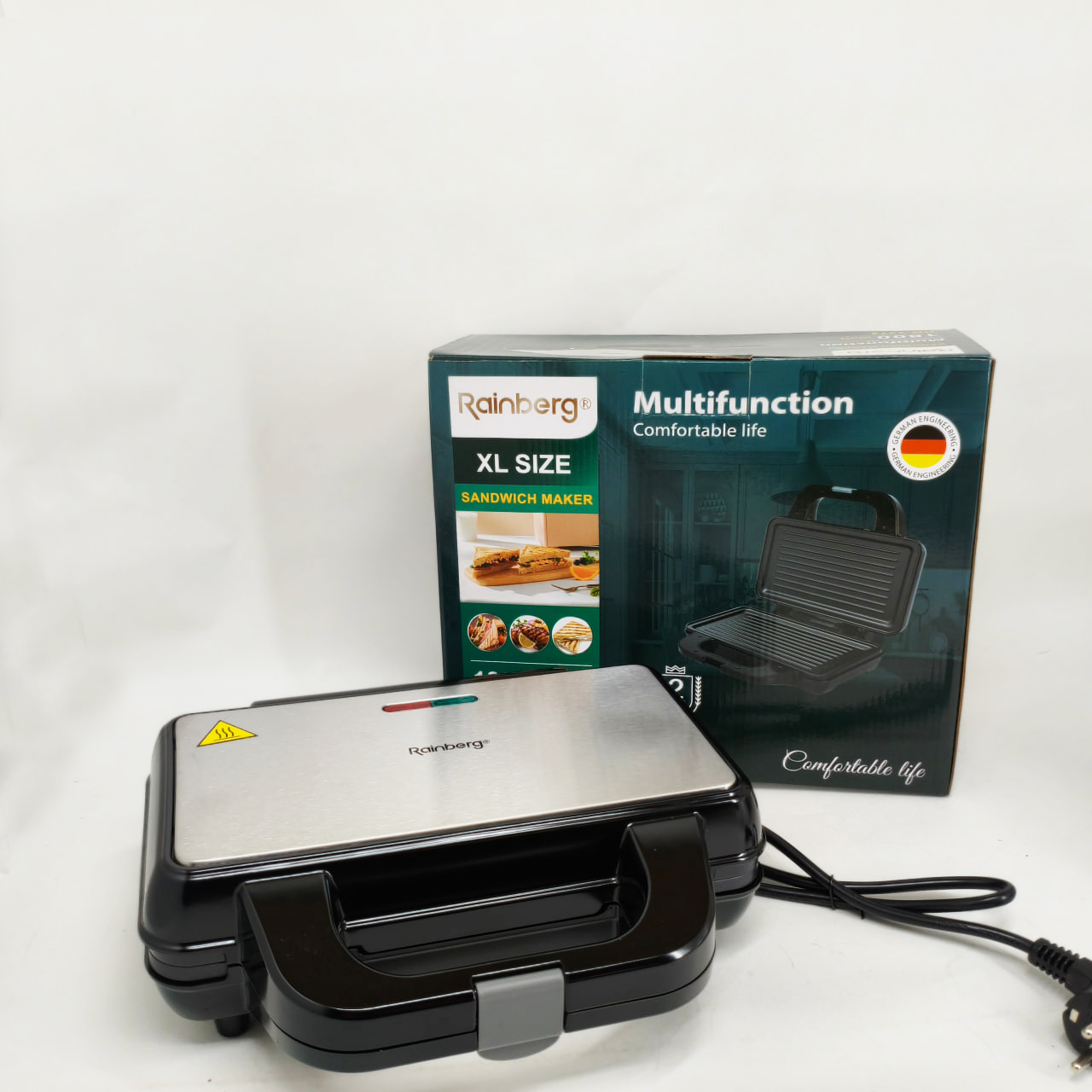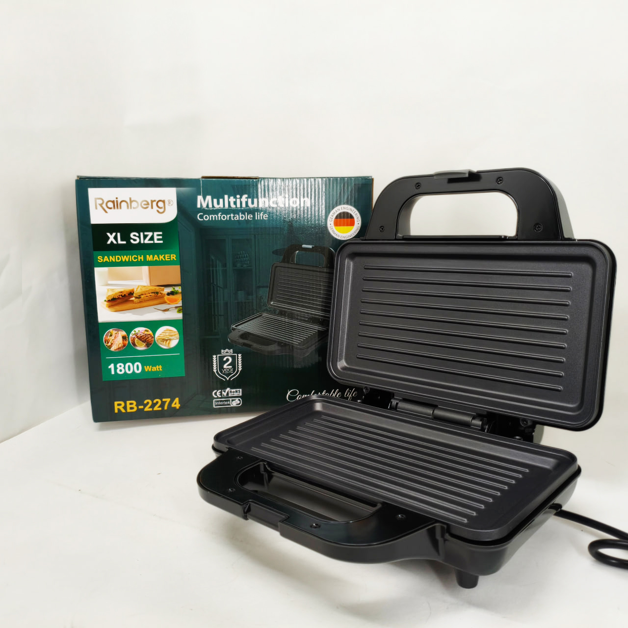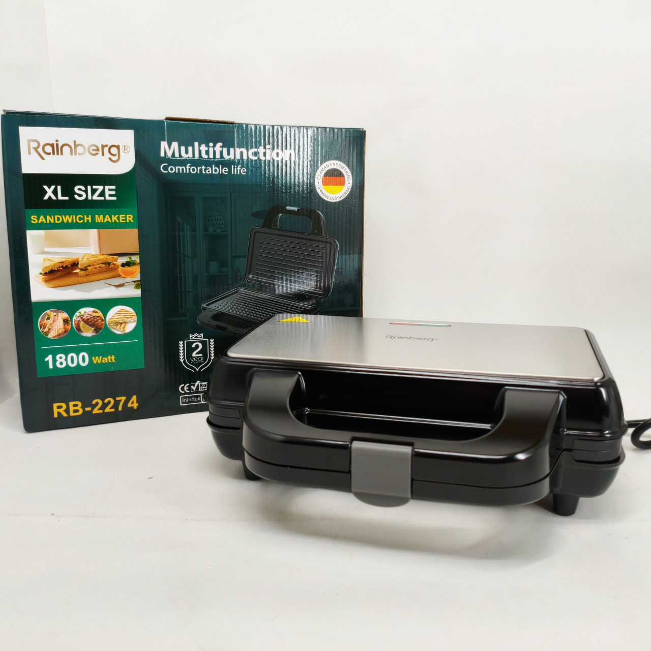 Електрогриль Rainberg RB-2274 – це універсальне рішення для приготування різноманітних страв із збереженням смаку та текстури. Завдяки потужності 1800 Вт він забезпечує швидкий і рівномірний нагрів до 230°C, що дозволяє смажити м’ясо, овочі, готувати гарячі бутерброди, піцу та підгрівати вже готові страви без зайвих зусиль. Надійна конструкція з металевого корпусу в поєднанні з зручним механічним керуванням роблять експлуатацію приладу комфортною і простою для щоденного використання.