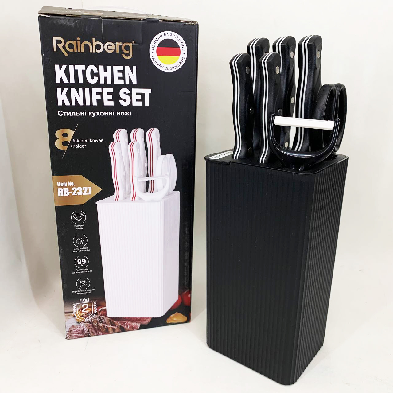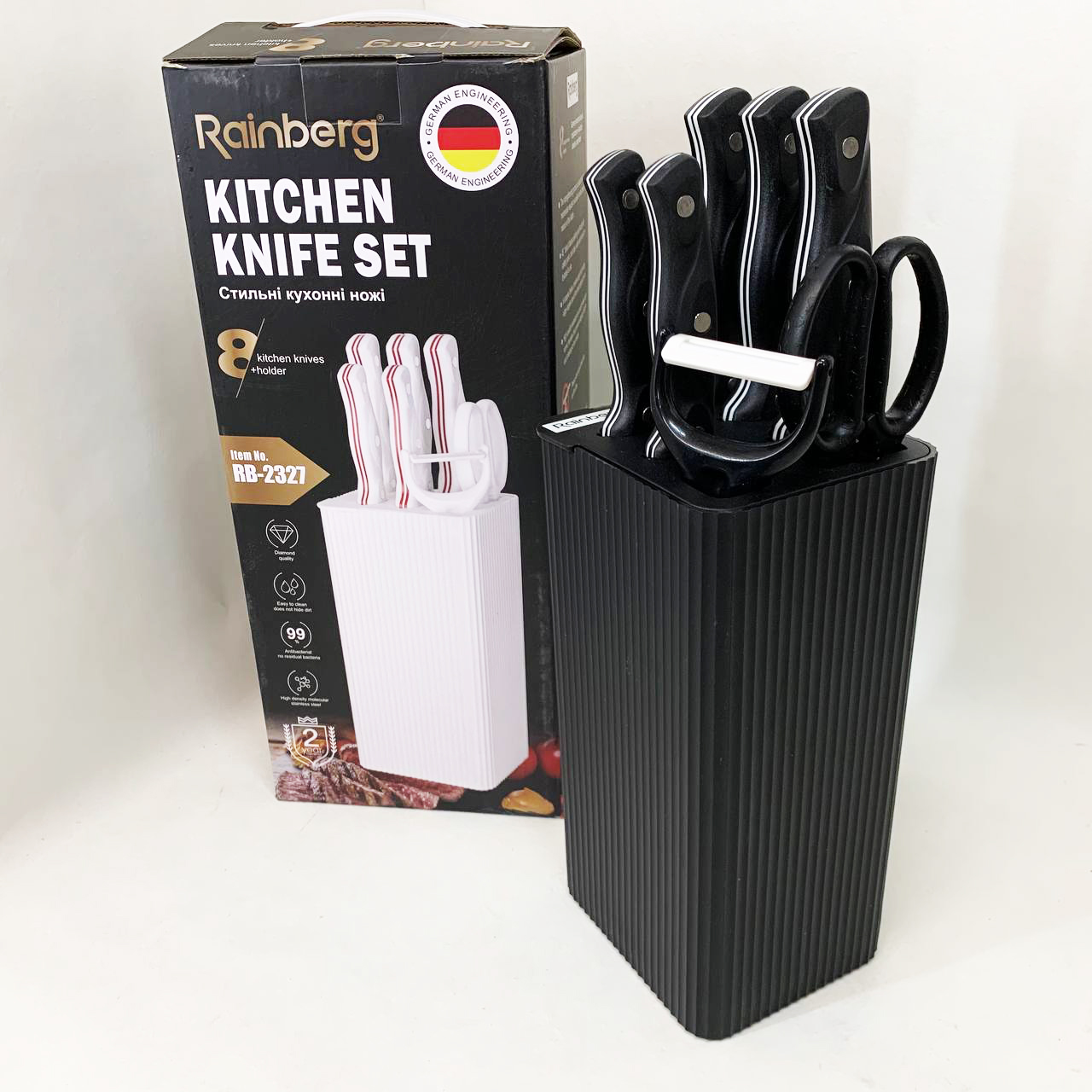 - Зручне та безпечне зберігання ножів у стильній підставці